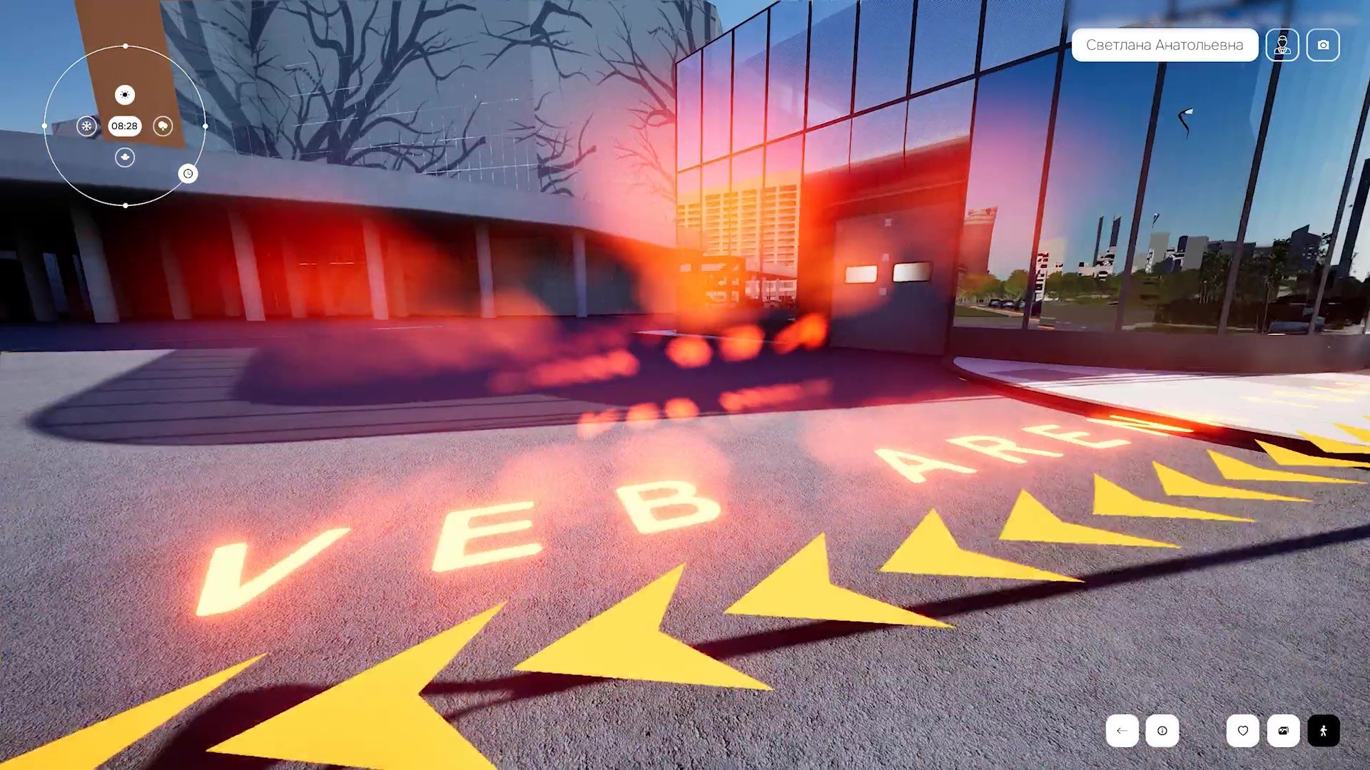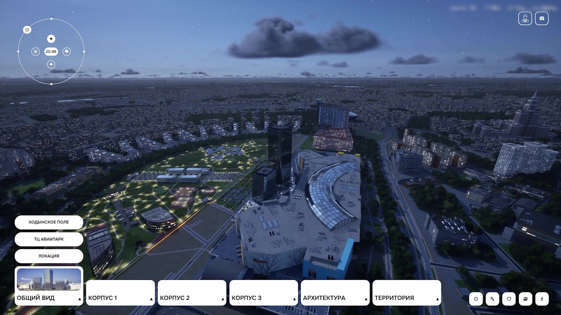 Цифровой двойник бизнес-центра и его окружения реализован на базе игрового движка Unreal Engine 5.5 и авторских программных разработок по управлению контентом.