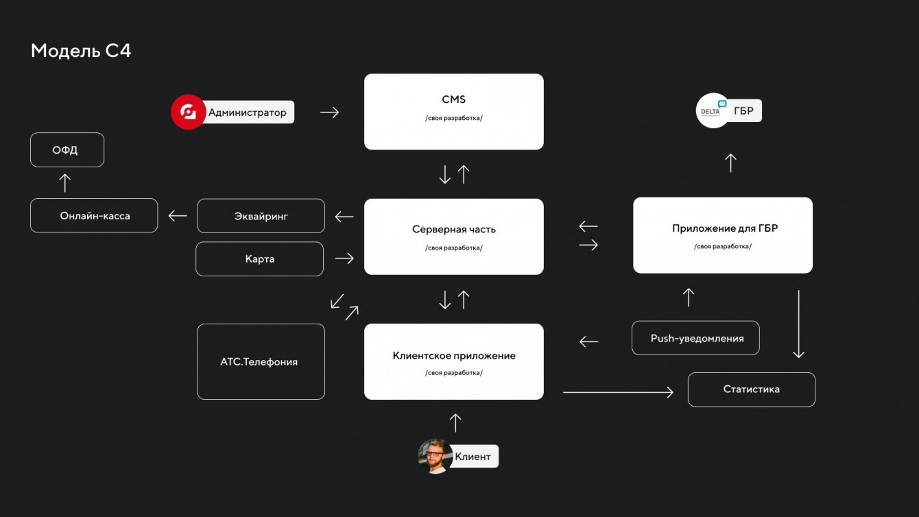 С точки зрения системной архитектуры, проект представляет собой 4 приложения: 2 для iOS и 2 – на базе Android, сервер REST API, служебные микросервисы (мессенджер, “аукцион” вызовов, геолокационный, и прочие), биллинговый сервис и внутренний портал для работы с охранными предприятиями.