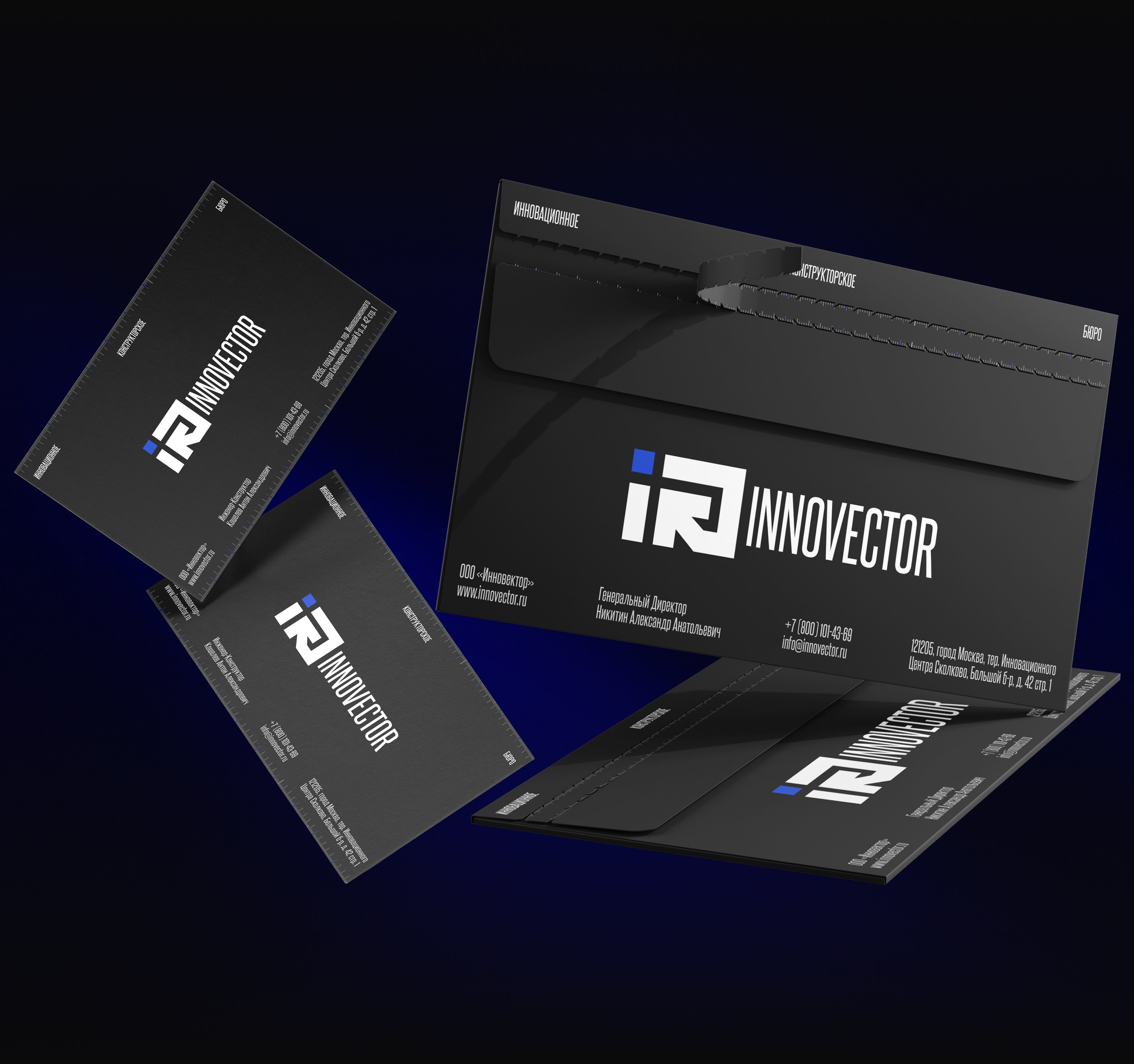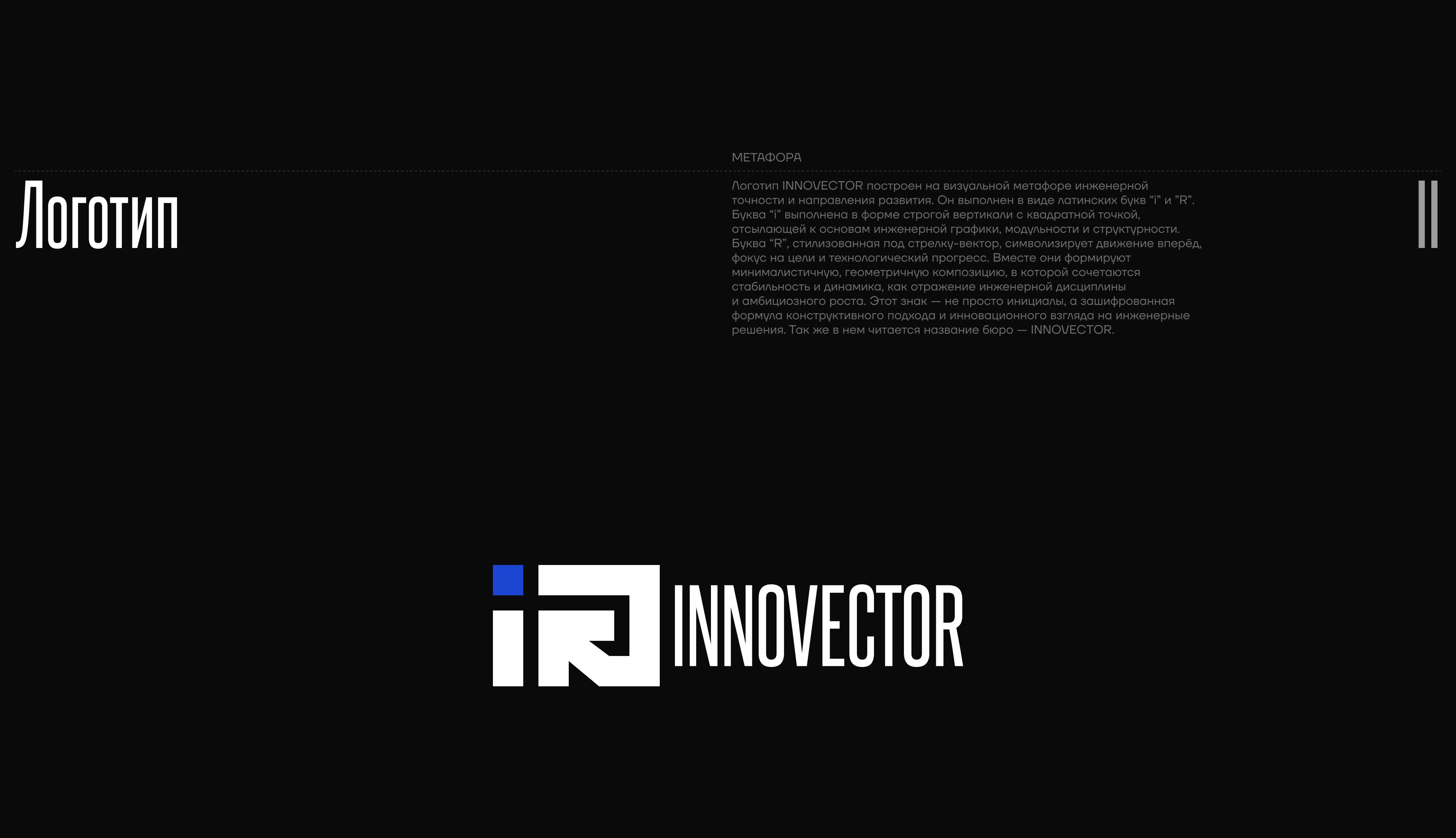 Логотип INNOVECTOR построен на визуальной метафоре инженерной точности и направления развития. Буква “i” выполнена в форме строгой вертикали с квадратной точкой, отсылающей к основам инженерной графики. Буква “R”, стилизованная под стрелку-вектор, символизирует движение вперёд, фокус на цели и технологический прогресс. Вместе они формируют минималистичную, геометричную композицию, в которой сочетаются стабильность и динамика, как отражение инженерной дисциплины и амбициозного роста. Этот знак —символ конструктивного подхода и инновационного взгляда на инженерные решения. Также в нем читается название бюро — INNOVECTOR.