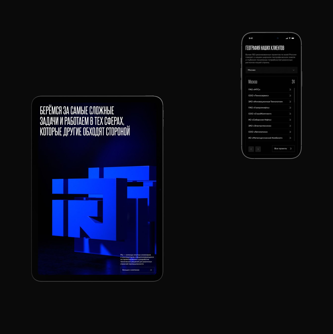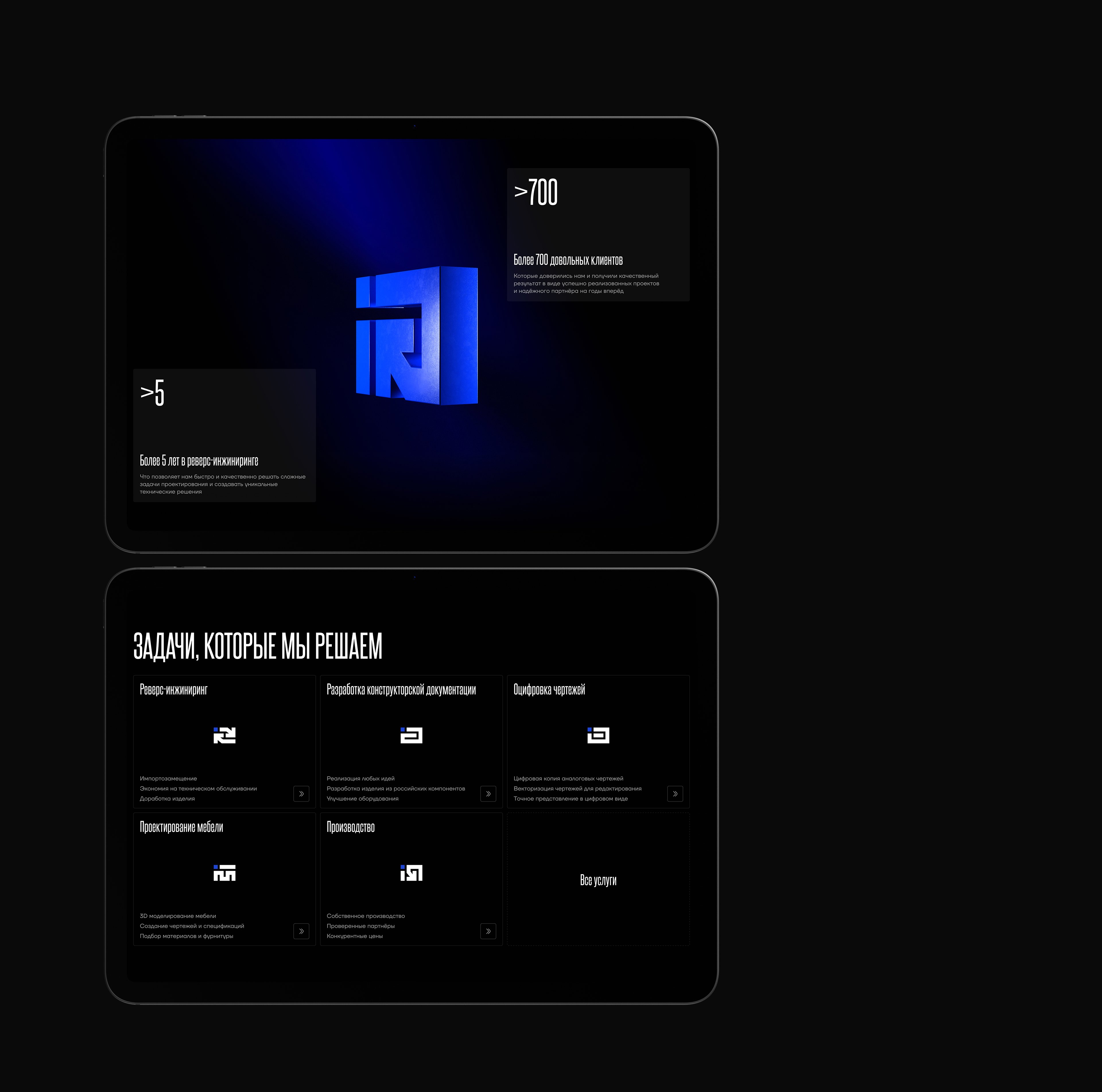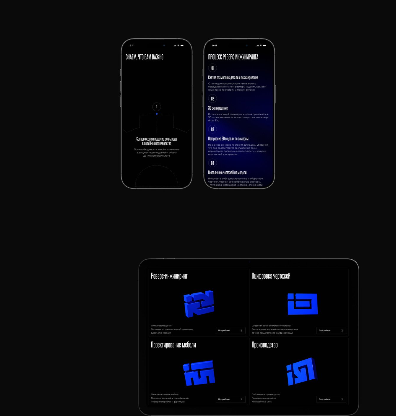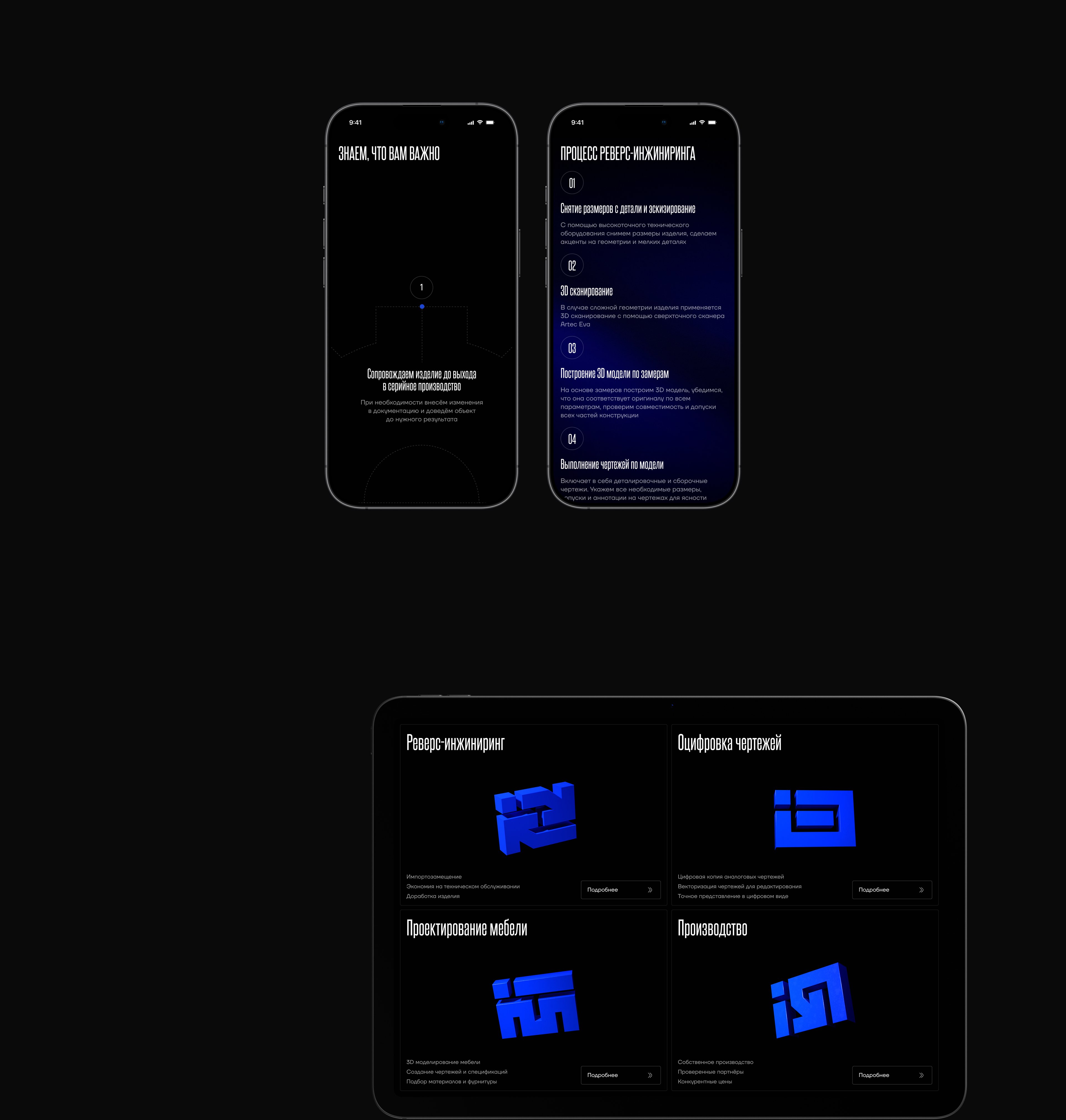 В рамках проекта мы провели полный цикл работ: от аналитики и структуры до финального визуального оформления. Создали уникальную визуальную систему, разработали иконографику и 3D-графику для услуг, выстроили дизайн в соответствии с инженерной эстетикой. Каждый этап был направлен на усиление экспертности компании и удобства восприятия сайта.