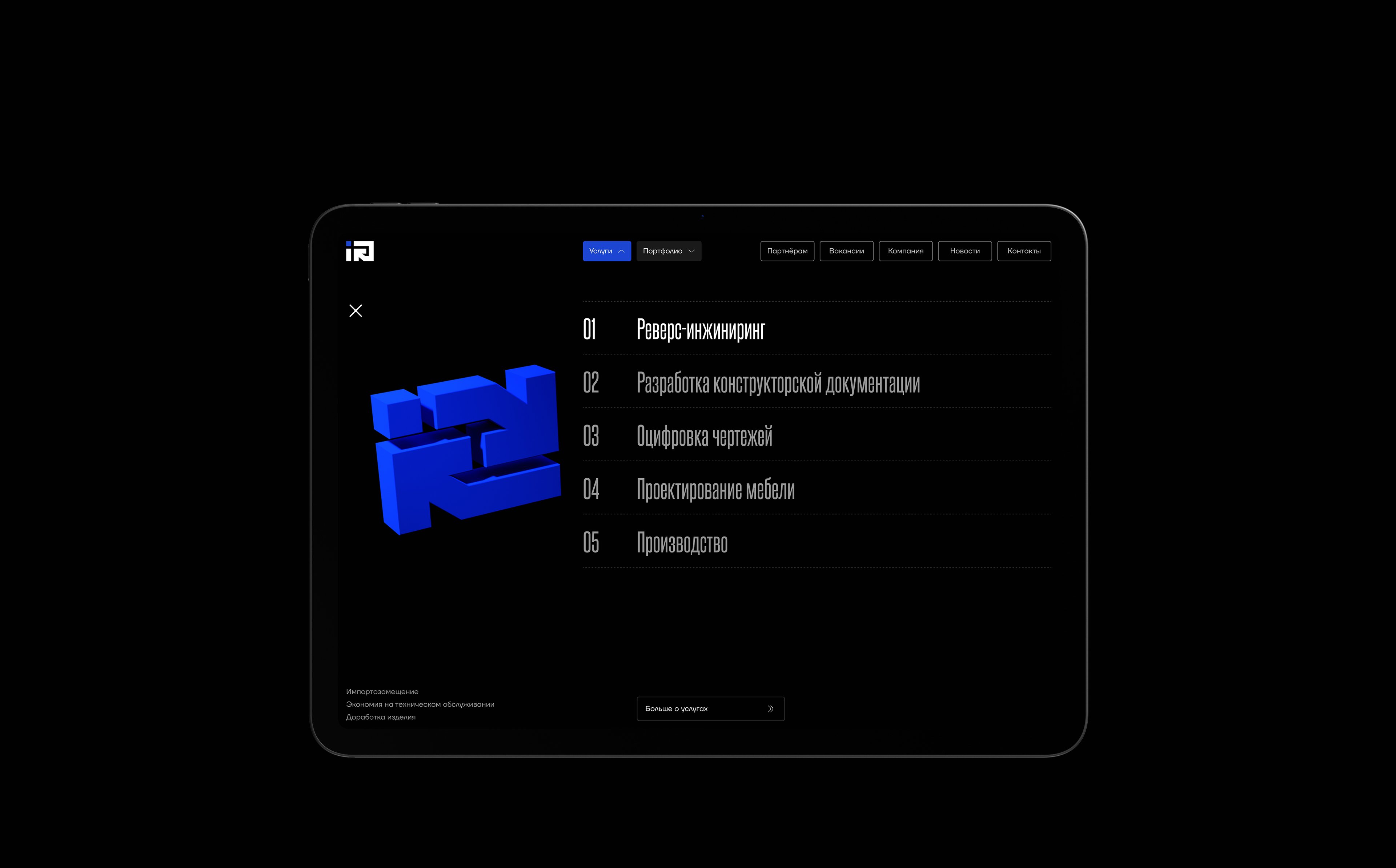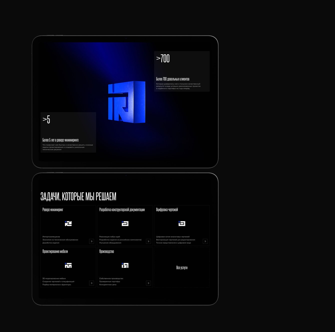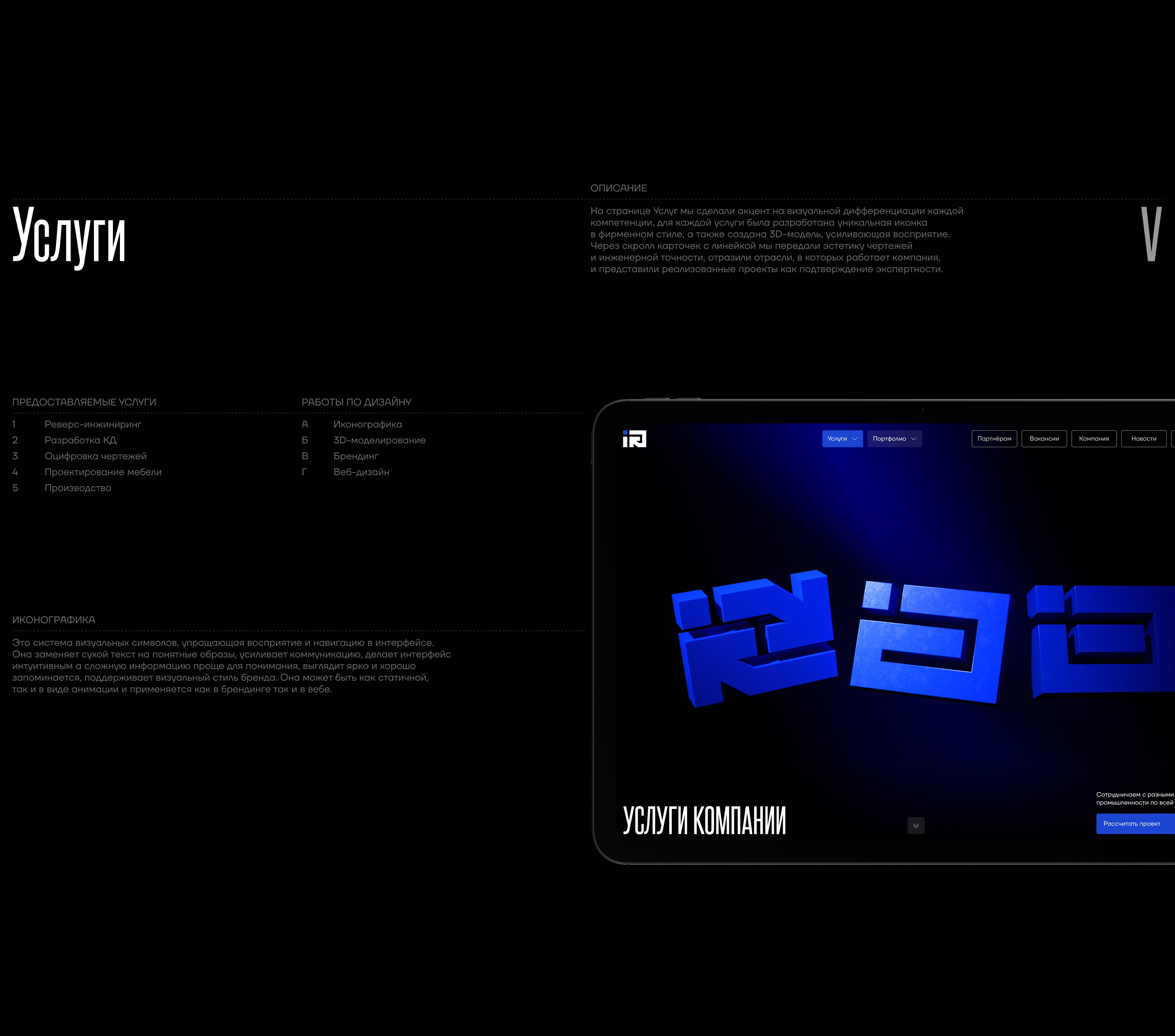 На странице Услуг мы сделали акцент на визуальном разделении, для каждой услуги была разработана уникальная иконка в фирменном стиле, а также создана 3D-модель. Через скролл карточек с линейкой мы передали эстетику чертежей и инженерной точности, отразили отрасли, в которых работает компания, и представили реализованные проекты как подтверждение экспертности.