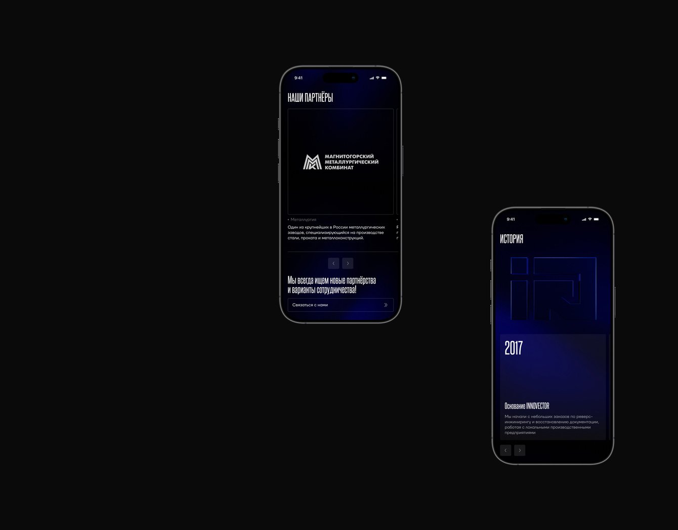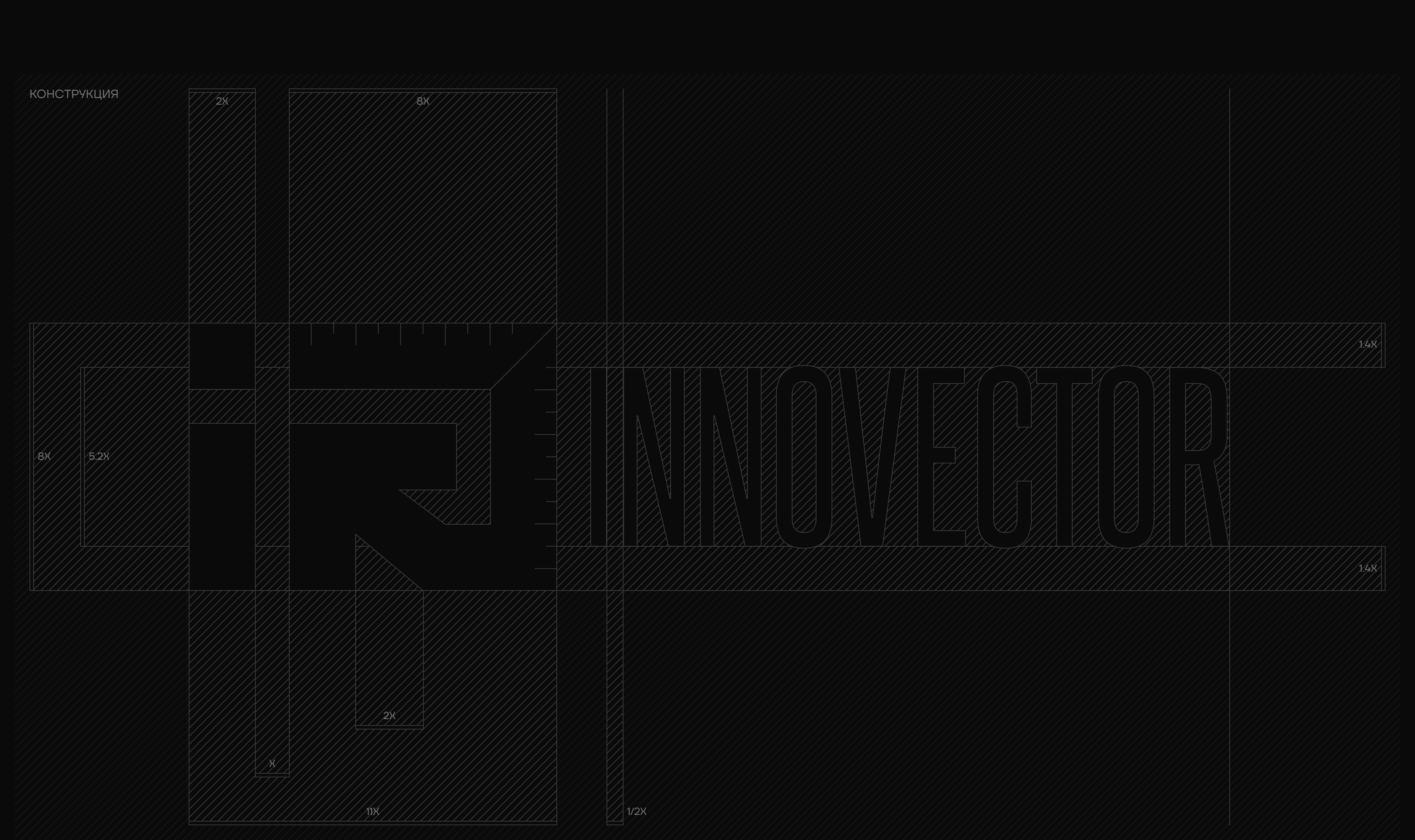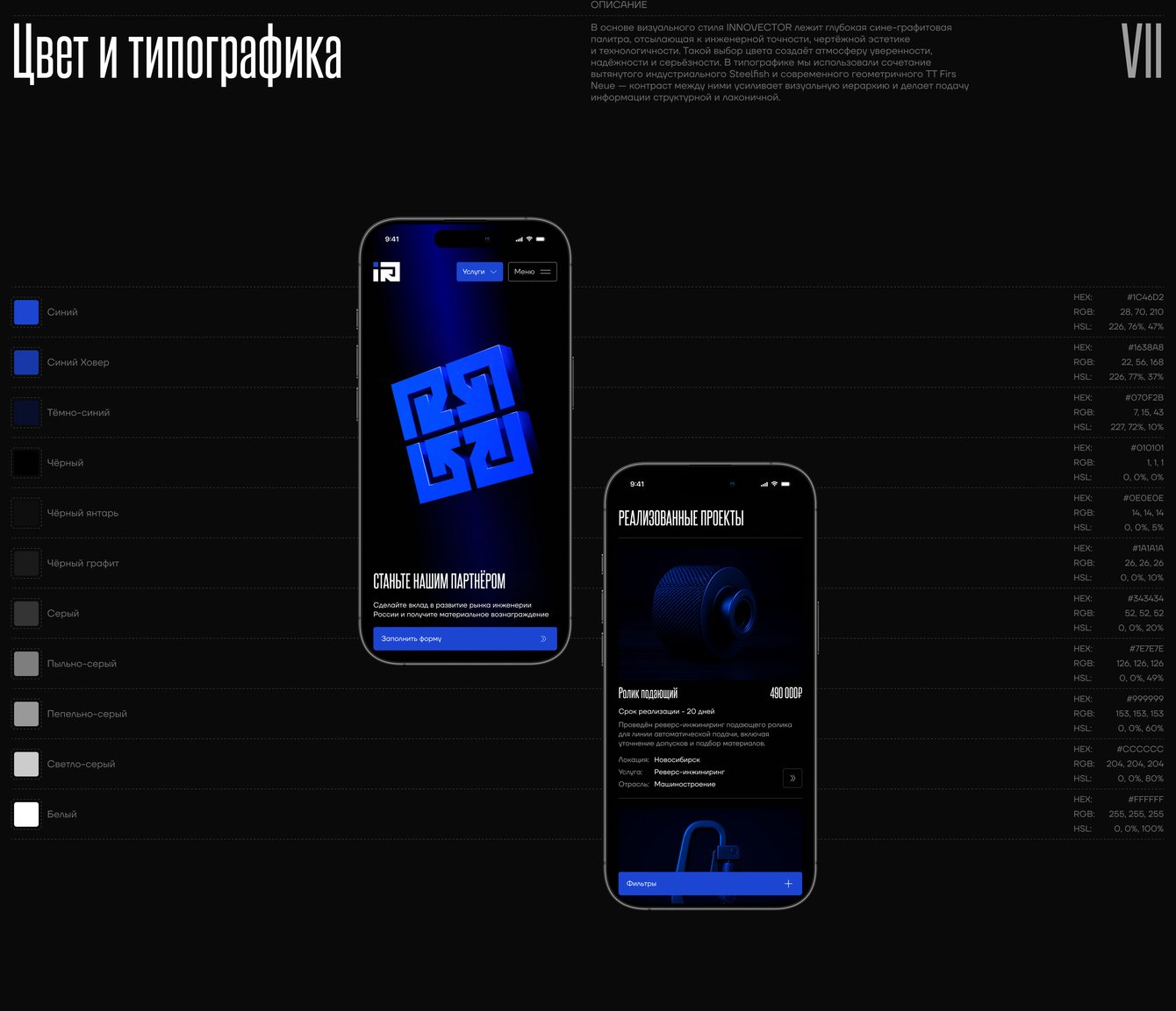 В основе визуального стиля INNOVECTOR лежит глубокая сине-графитовая палитра, отсылающая к инженерной точности, чертёжной эстетике и технологичности. В типографике мы использовали сочетание вытянутого индустриального Steelfish и современного геометричного TT Firs Neue — контраст между ними усиливает визуальную иерархию и делает подачу информации структурной и лаконичной.