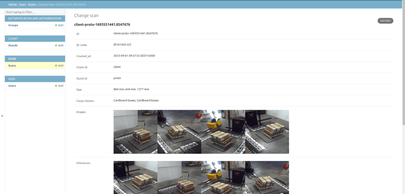 После система собирает пул реальных данных о товаре и отправляет эти данные на back-end. Там создается объект скана с данными: размер груза, вес, дефекты, тип груза. После вся информация идет в панель клиента.