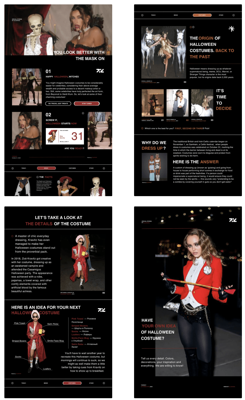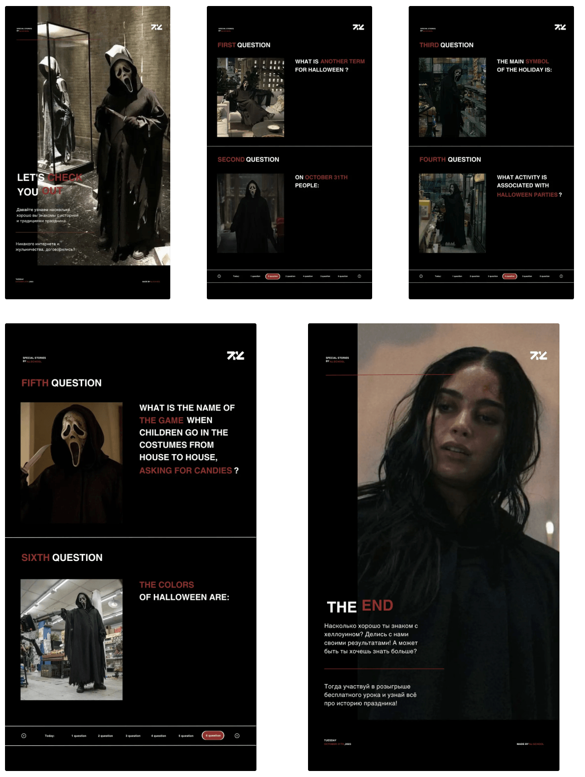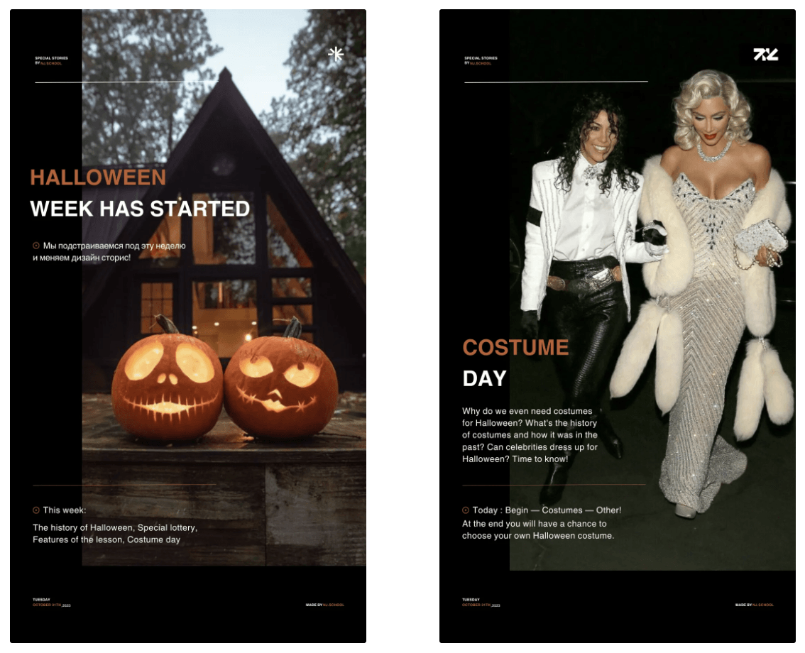 Эти сторис были созданы, чтобы отпраздновать Хэллоуин, вовлечь сообщество школы NJ и сделать контент актуальным и сезонным.