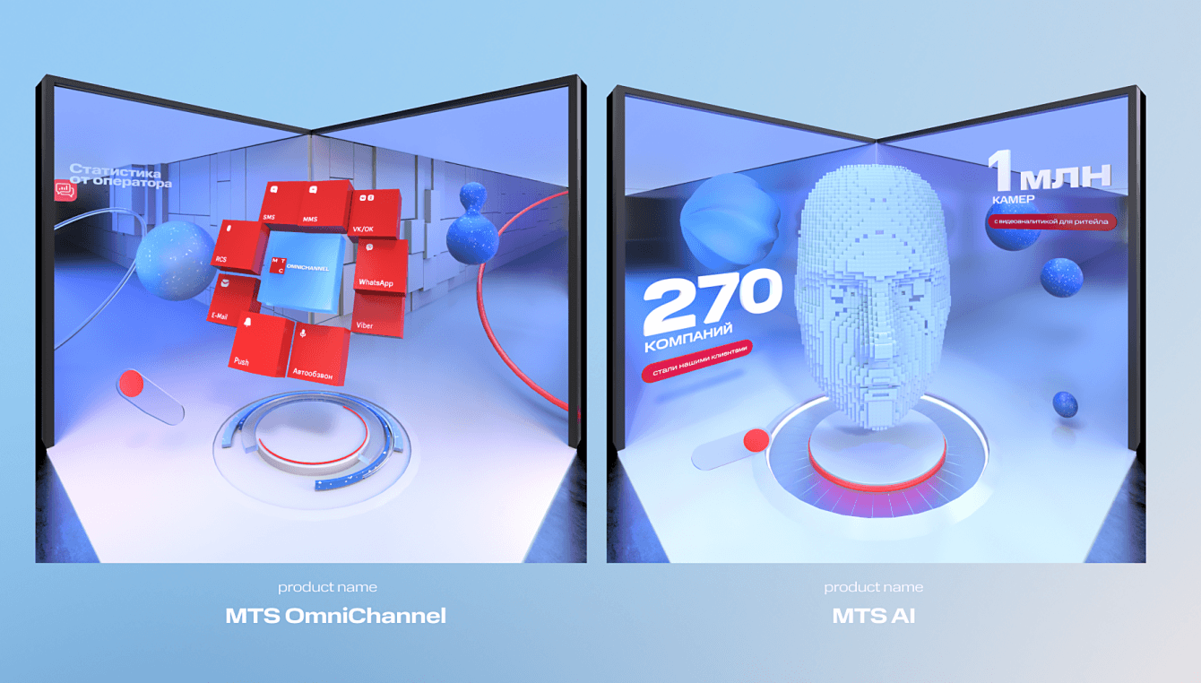 Решением стала инсталляция «Иммерсивный угол» с эффектом naked eye — она позволила полностью отразить системный подход МТС к В2В. Каждая грань куба отражала конкретный продукт — ее активация позволяла развернуть на экране представление с информацией и инфорграфикой о нем. Также пользователь мог перемещаться по пространству и детально изучить все продукты с помощью 6 тач-скринов.