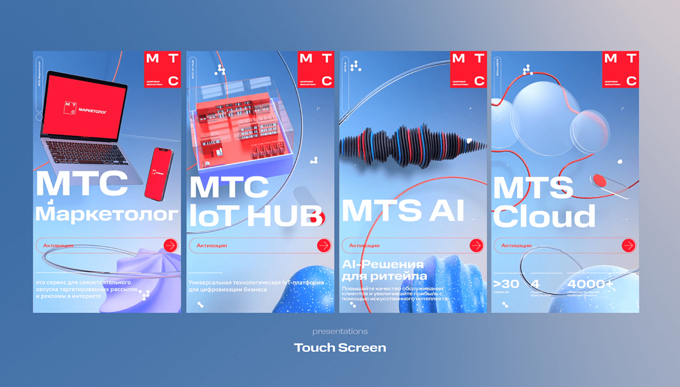 Проект помог МТС рассказать целевой аудитории о готовых решениях для бизнеса в понятной и интерактивной форме, а также погрузить в новый бренд через призму активации. Пользователи могли взаимодействовать с кубом и увидеть объемную проекцию с основной информацией о продуктах и компании, а затем продолжить погружение в продукты на тач-скринах. Такое интерактивное взаимодействие помогает погрузиться в бренд и продукт и «прочувствовать» их.