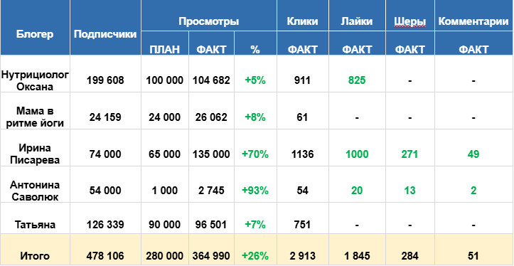 Наибольшее перевыполнение плана было отмечено у блогеров, аудитория которых делилась публикациями. У Ирины Писаревой (тематика — здоровье и правильное питание, количество подписчиков на момент публикации 74 000) перевыполнение плана по просмотрам на 70%, а у Антонины Саволюк (с аналогичной тематикой, количество подписчиков 54 000) на 93%.