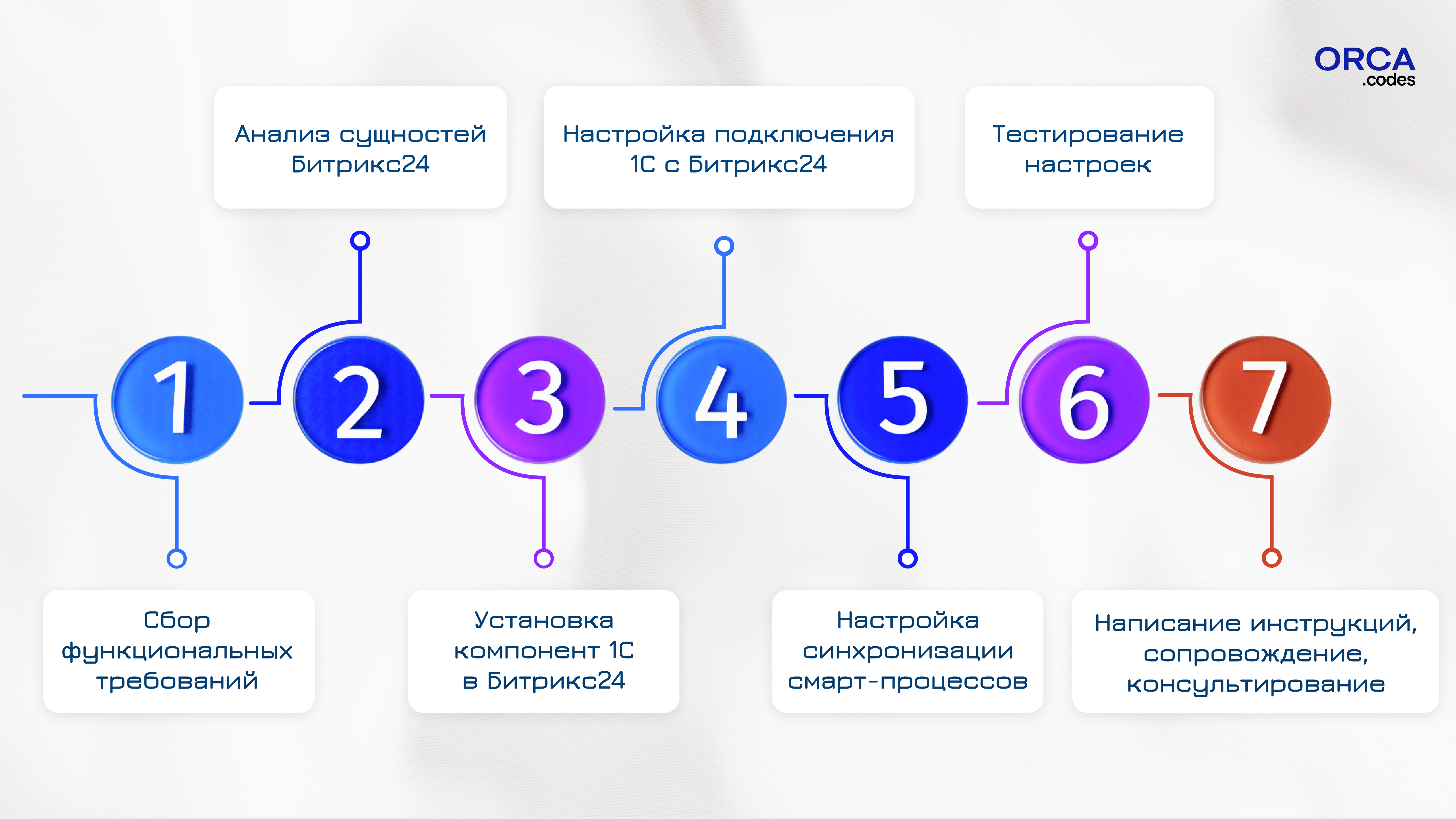 Для выполнения задачи в установленные сроки (Май 2024 – Февраль 2025) была реализована комплексная интеграция на базе стандартных инструментов 1С и Bitrix24