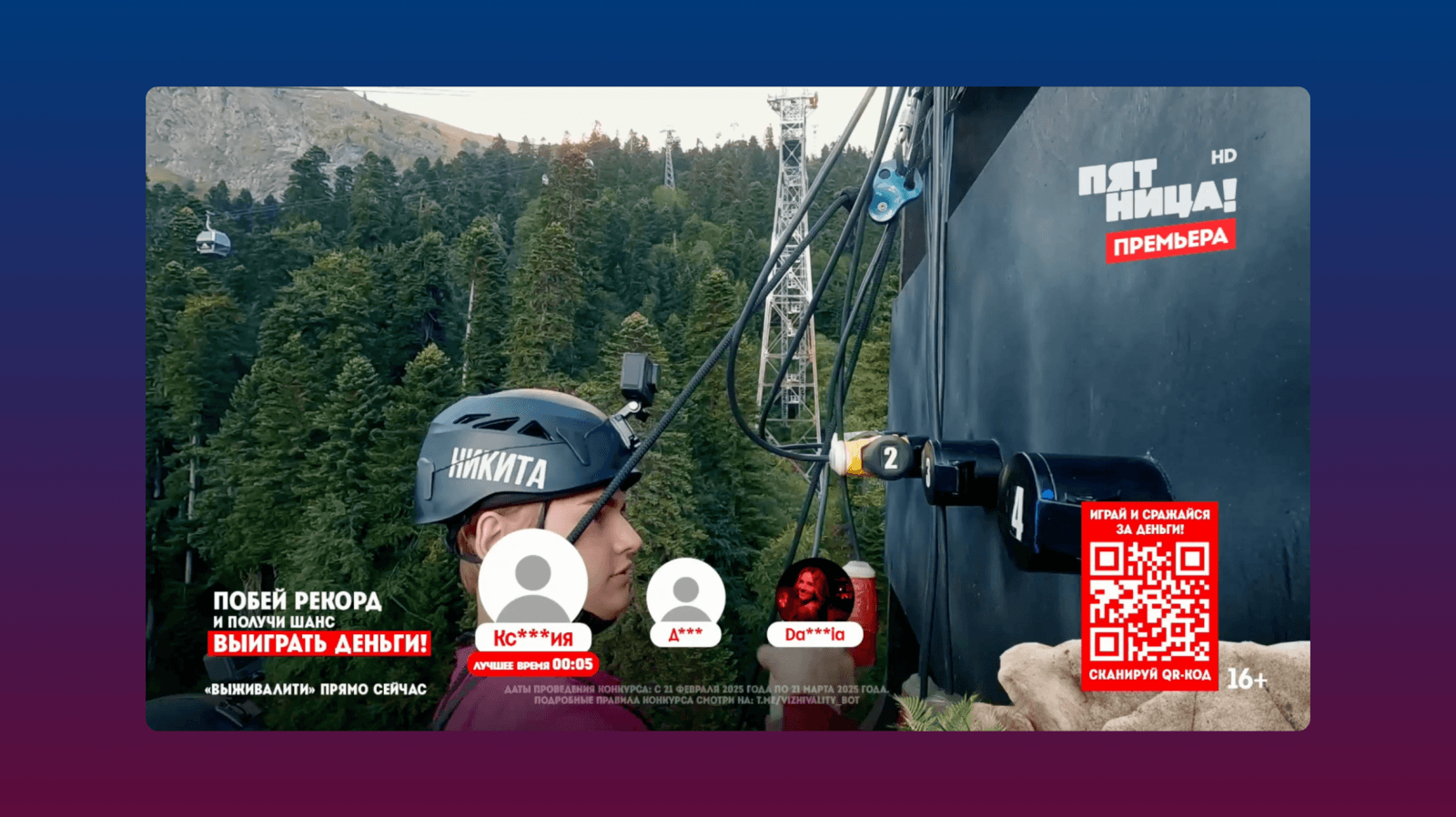 Для зрителя это работало так: увидел QR-код на экране — открыл бот, прошел испытание, оказался в числе лидеров — увидел себя на ТВ.