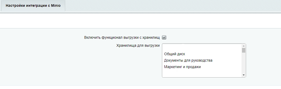Клиент использует облачное хранилище Minio, для которого в корпоративном портале было создано отдельное дисковое пространство.