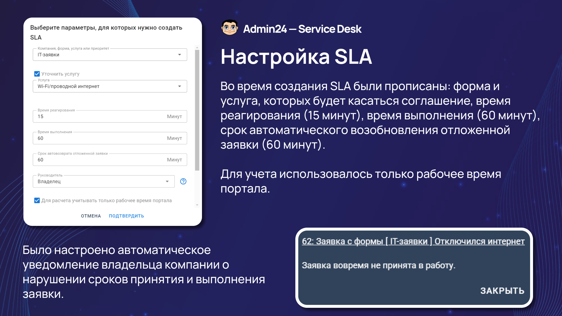 SLA ( от англ. Service Level Agreement) – соглашение об уровне предоставления услуги. И хотя зачастую его заключают между компанией и клиентом, SLA можно использовать и для того, чтобы указать максимальное время, в течение которого внутренняя техническая поддержка должна отреагировать на запрос. В Admin24 можно указать SLA для конкретной формы, компании, услуги или приоритета.