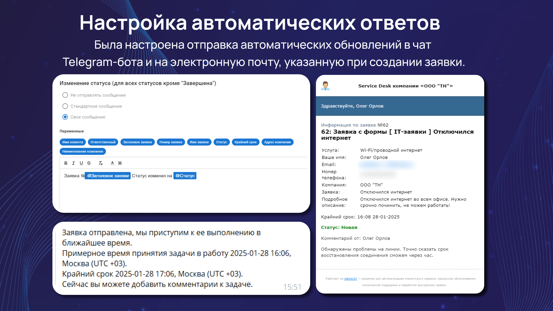 Чтобы сотрудники знали, что про их заявку точно не забудут, были настроены автоматические сообщения. Они самостоятельно отправляются пользователю на каждом этапе обработки его заявки.