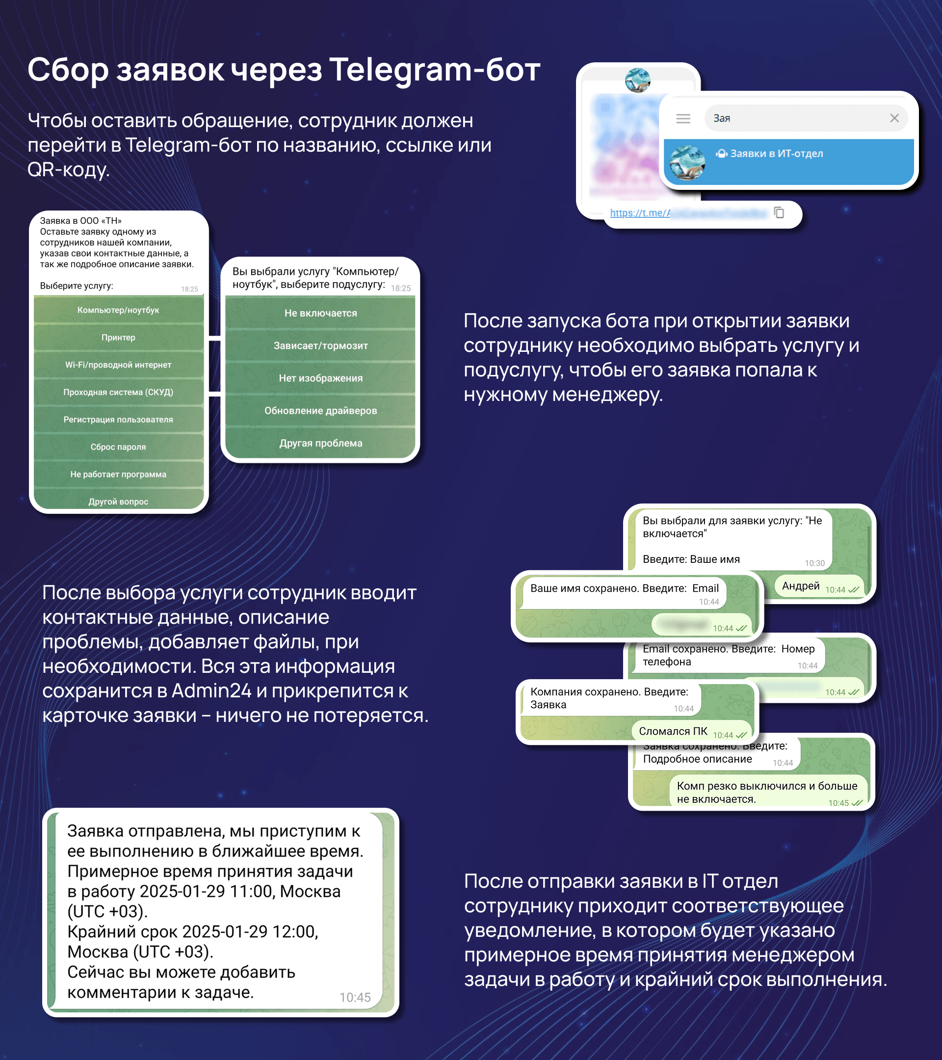 Компании потребовалось настроить систему заявок для организации внутренней поддержки сотрудников, а в частности – для отправки обращений о поломке оргтехники, ПК и проблемах с цифровой инфраструктурой в IT-отдел. С этой целью потребовалось внедрение Service Desk с интеграцией Telegram.