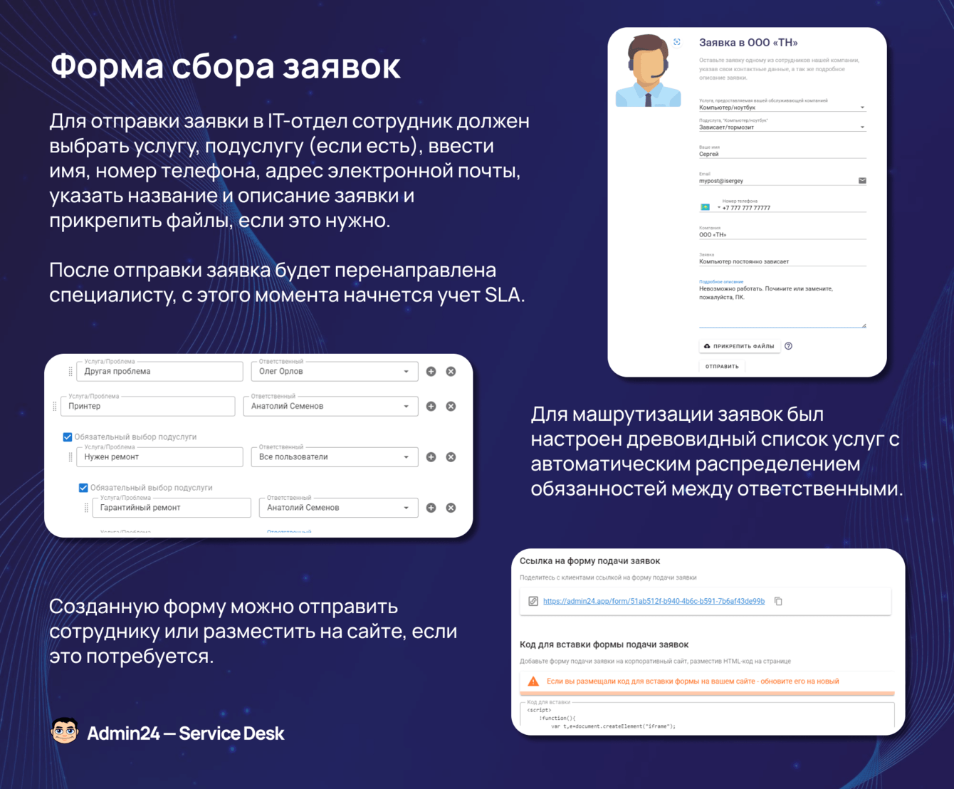 В Admin24 формы для сбора заявок автоматизируют большое количество бизнес-процессов, экономя время и деньги вашей компании. Они необходимы для систематизации и упрощения процесса обработки запросов на техническую поддержку. Формы собирают всю необходимую информацию в структурированном виде, что помогает IT-специалистам быстрее понять суть проблемы, автоматически маршрутизируют заявки по ответственным, избавляя сотрудников от необходимости вручную перебирать множество электронных писем или искать заявки в Excel.