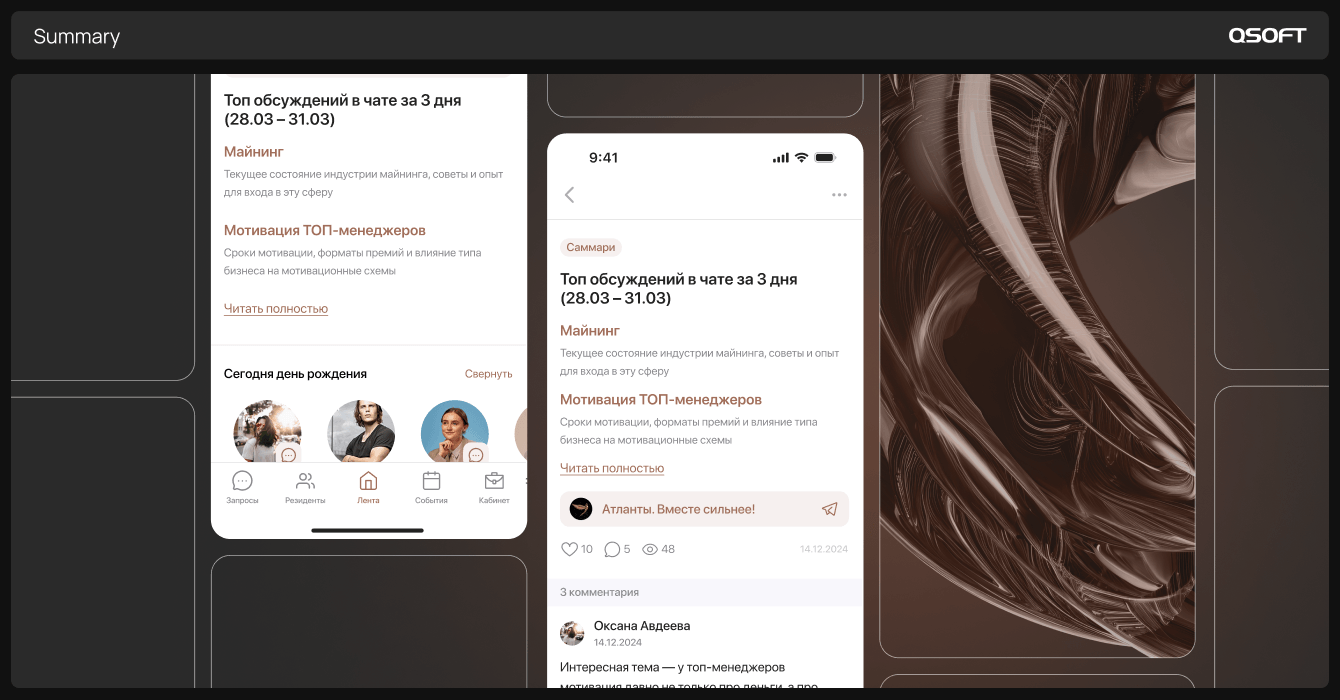 Команда QSOFT обеспечила бесперебойную передачу данных через бота и настроила публикацию саммари в ленте приложения ровно в 06:00. В процессе мы устранили технический конфликт часовых поясов между сервером ИИ (GMT+4) и локальным сервером (GMT+3), который приводил к сбоям в работе автоматических задач (cron). Теперь актуальный контент формируется и публикуется без задержек.