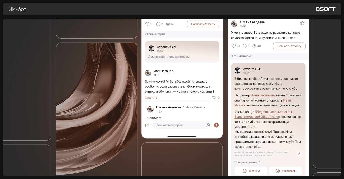 Мы реализовали визуальную часть и логику отображения AI-ассистента, обученного на базе знаний клуба. Главным вызовом стала скорость: пользователь не должен «висеть» в ожидании ответа.