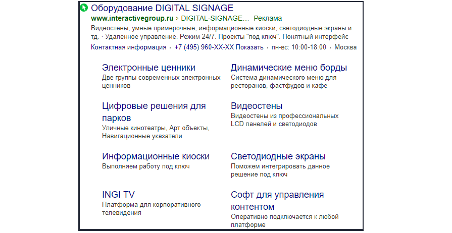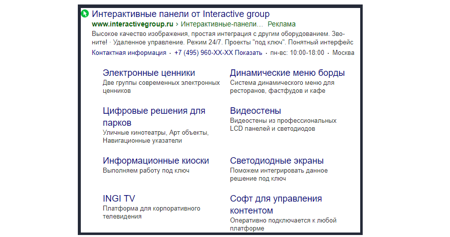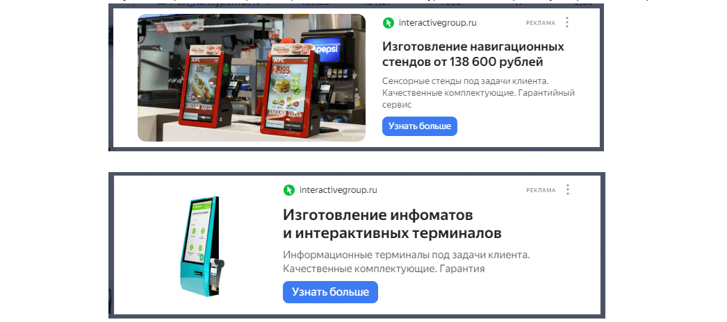 Общая кампания на поиске — стандартная кампания со всеми направлениями услуг и товаров, ГЕО — вся Россия. Ключи использовались максимально целевые, т.к. клик в данной нише достаточно дорогой. Например, для группы «Интерактивные панели или экраны» продвигались по ключам «детская интерактивная панель», «интерактивная led панель», «интерактивный игровой экран», «интерактивный экран +для детей», «информационные интерактивные экраны» и др.)