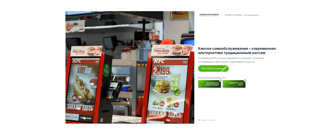 Мы так воодушевились результатами квиза на меню-борды, что по горячим следам запустили еще один — по продукту киоски самообслуживания. Протестировали 2 варианта — с картинками в вопросах и без картинок. Оба отработали одинаково.