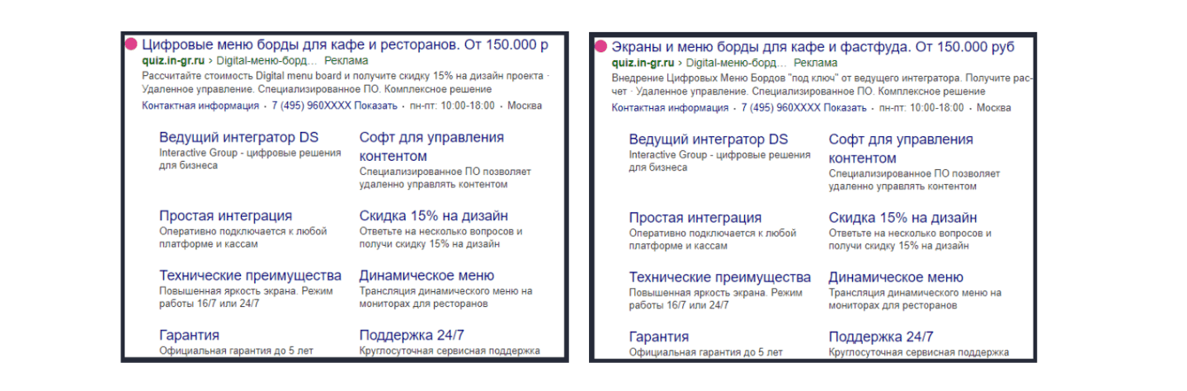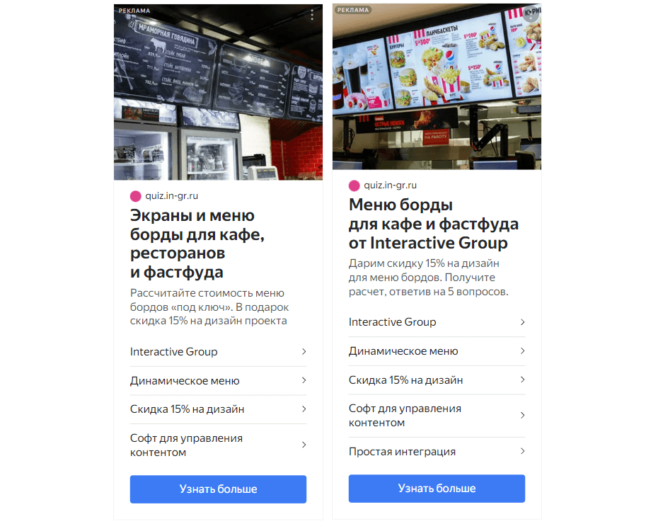 На поиске оставили основную кампанию по всем направлениям на автостратегии, чтобы вести поддерживающий трафик. Запустили кампанию по всем ключам на тему меню-бордов на квиз с оплатой за клики.