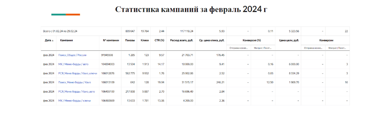 Продолжили тестировать новые РК. В феврале работали 5 кампаний, ведущих на квиз, и 1 старая кампания на поиске.