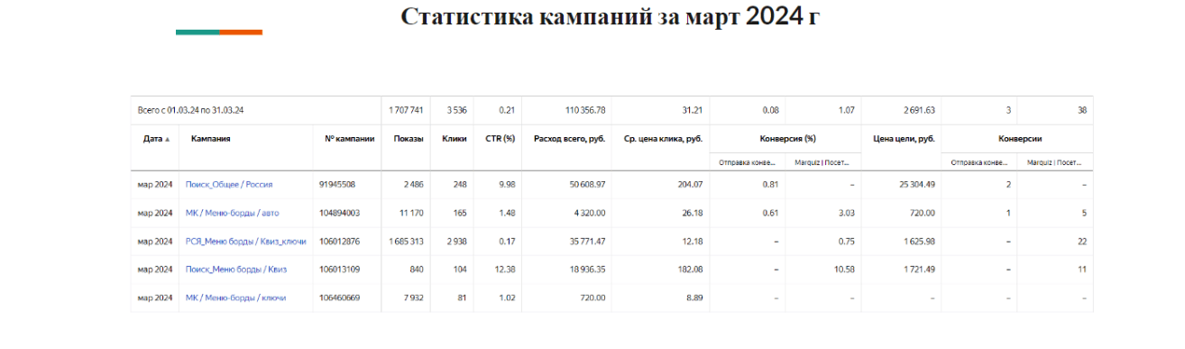 К марту новые кампании, ведущие на квиз, оптимизировались — мы проанализировали результаты и убрали РК на РСЯ на автотаргетинге с оплатой за клики. А в начале марта остановили и Мастера кампаний по ключевым словам с оплатой за клики — он тоже не принес конверсий.