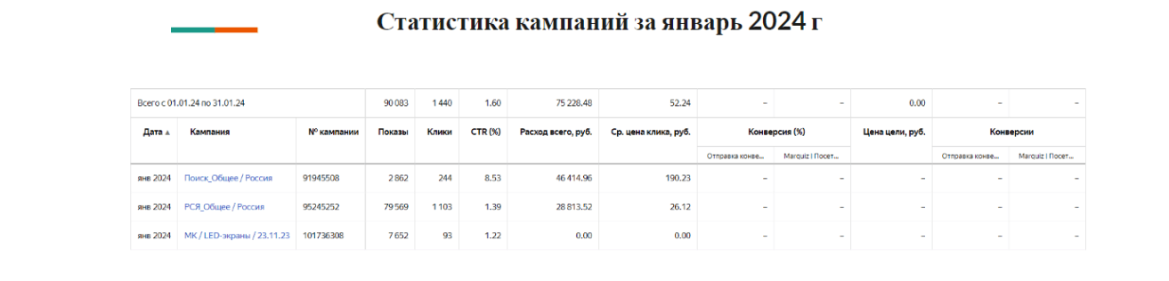 Мастер кампаний по направлению LED-экраны. Запускались по «интересам и привычкам», семантику использовали ту же. Кампания работала с оплатой за конверсии, но конверсий с нее мы не получили, поэтому расходов не было.
