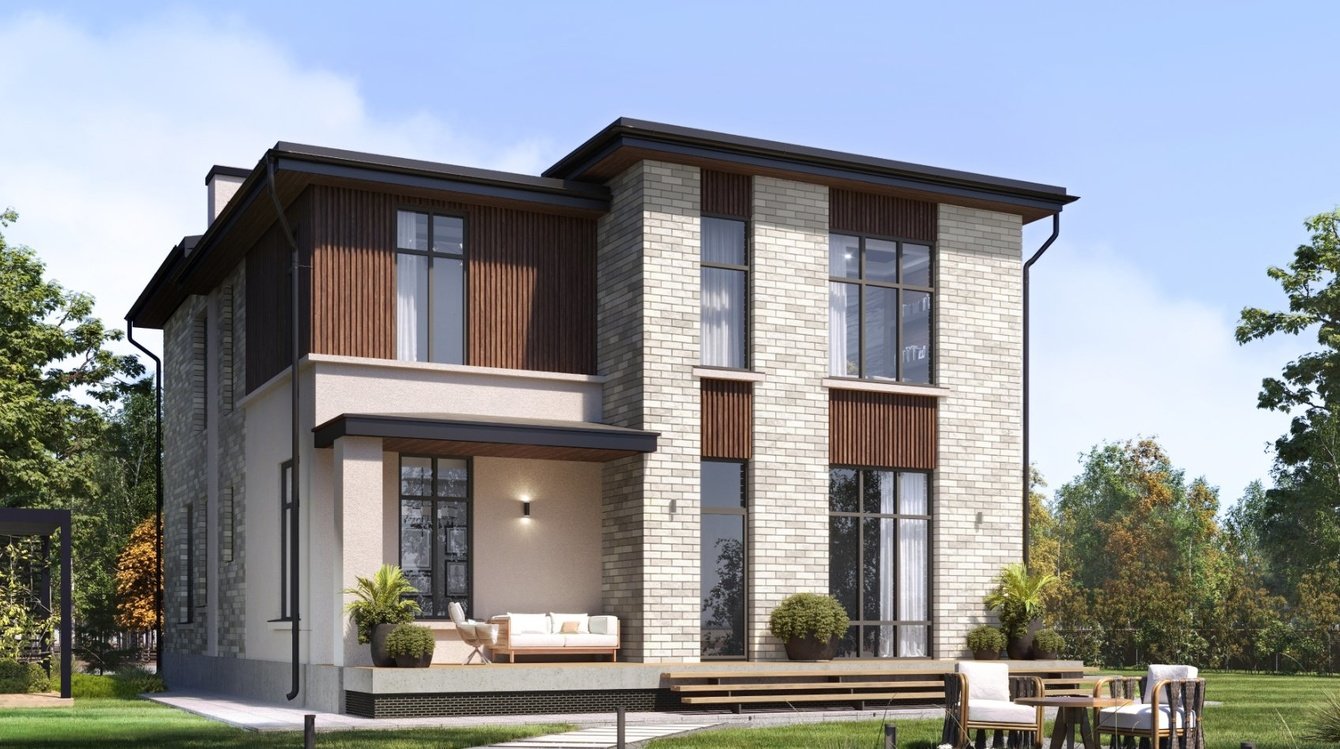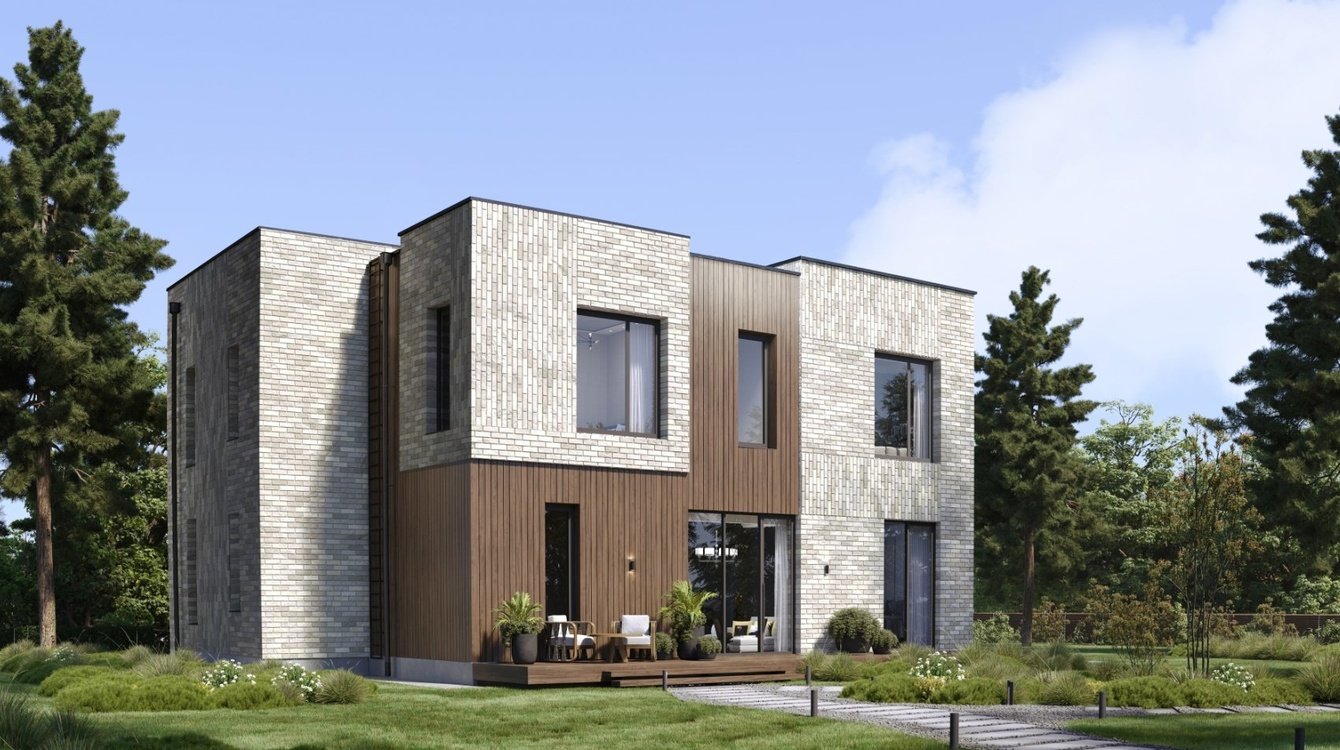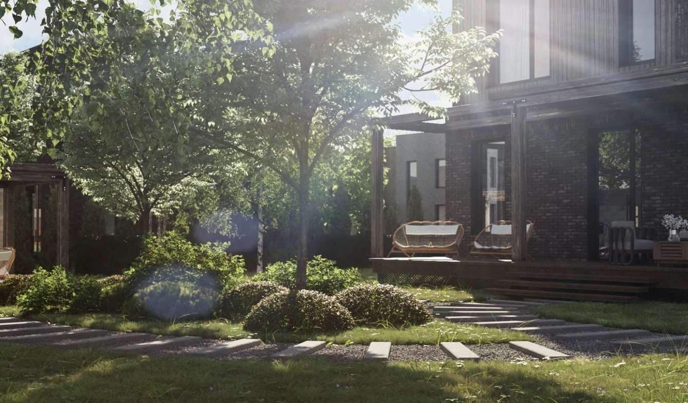 Отличительной чертой домов является простая геометрия, естественное освещение, использование нейтральных природных оттенков и фактур. Основные фасадные материалы – кирпич ручной формовки и натуральное дерево.