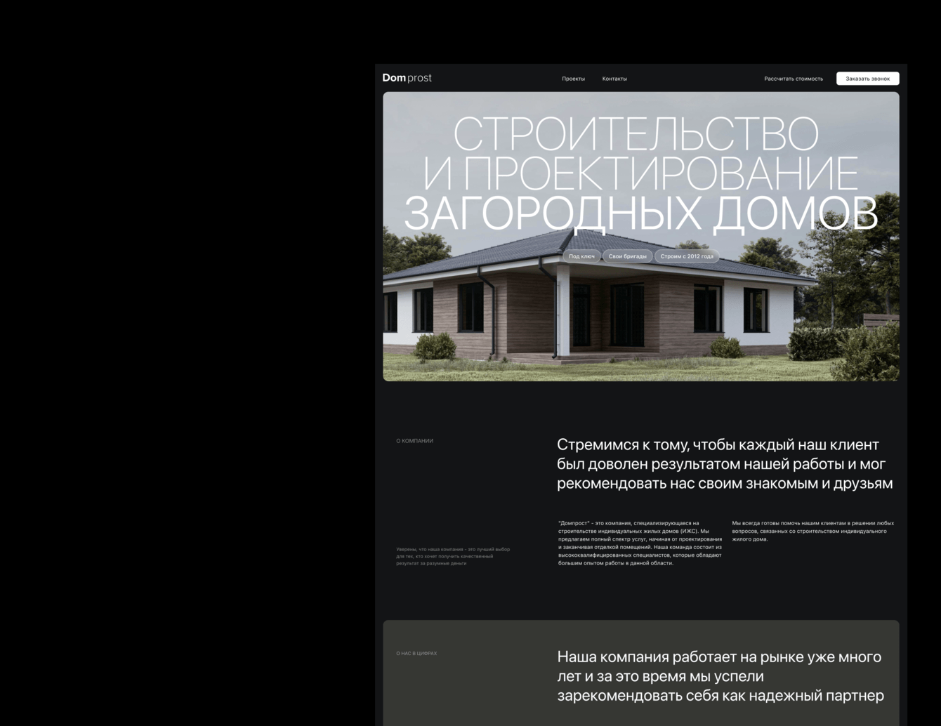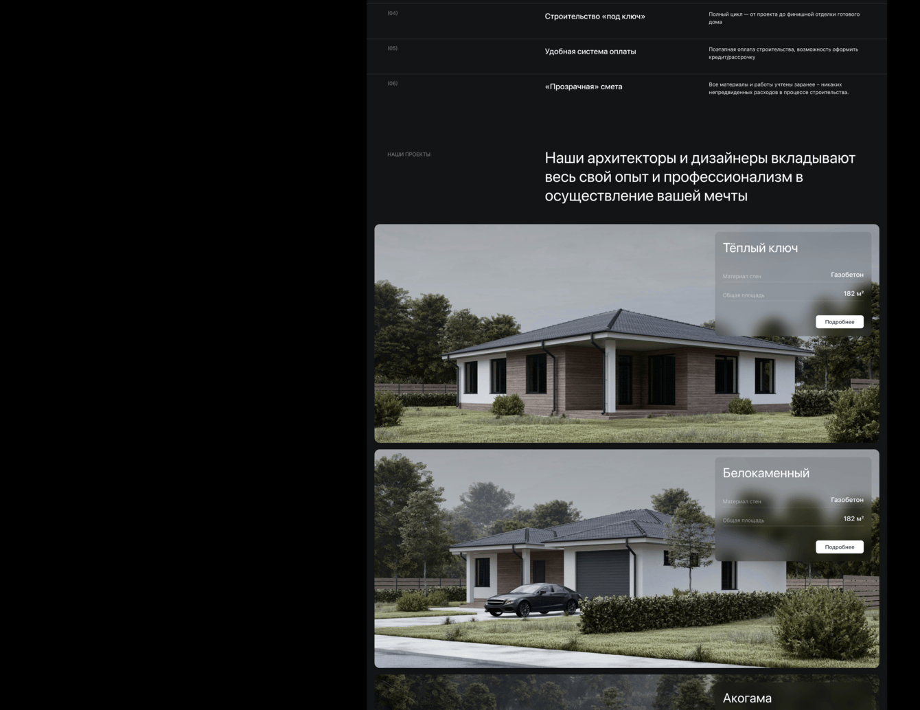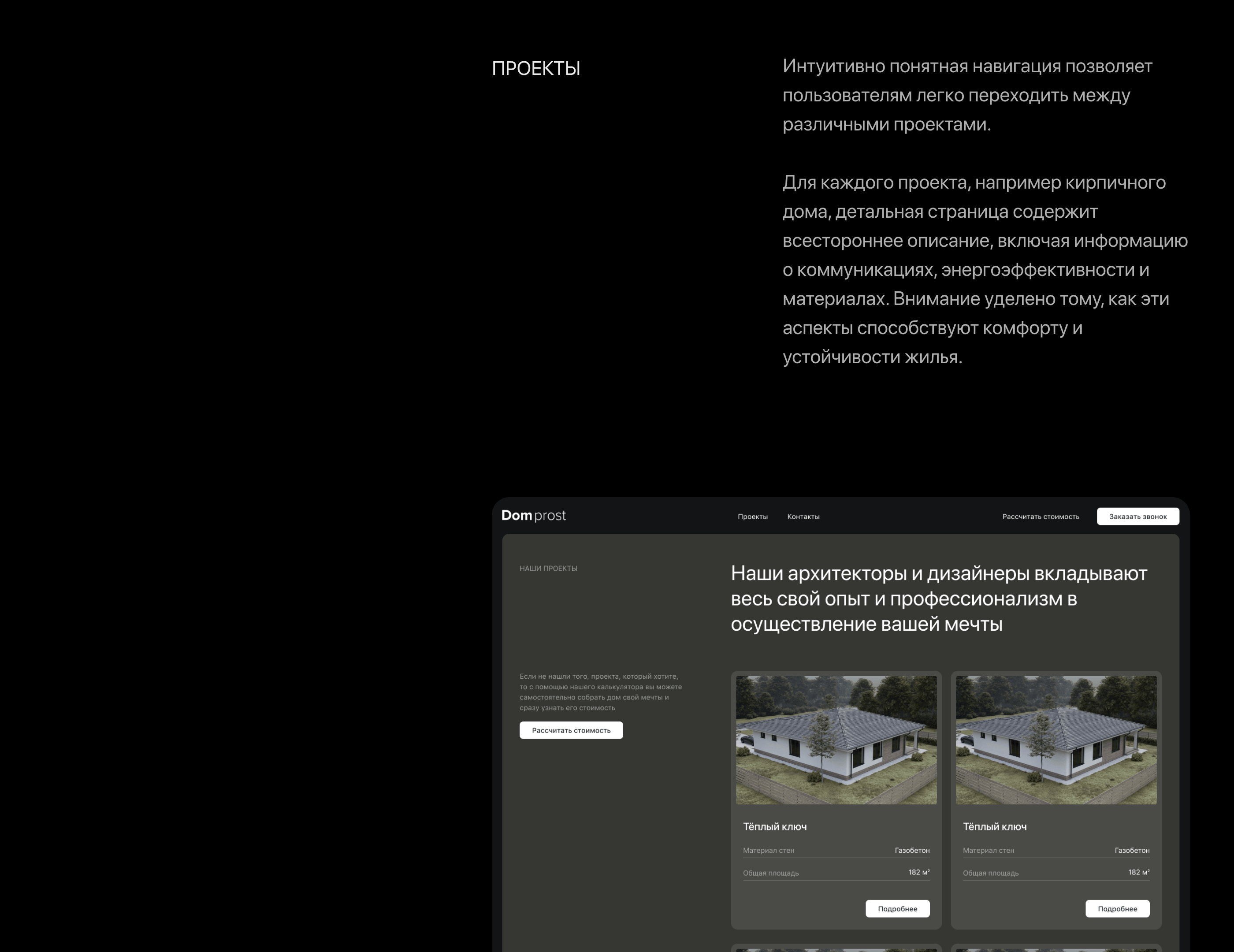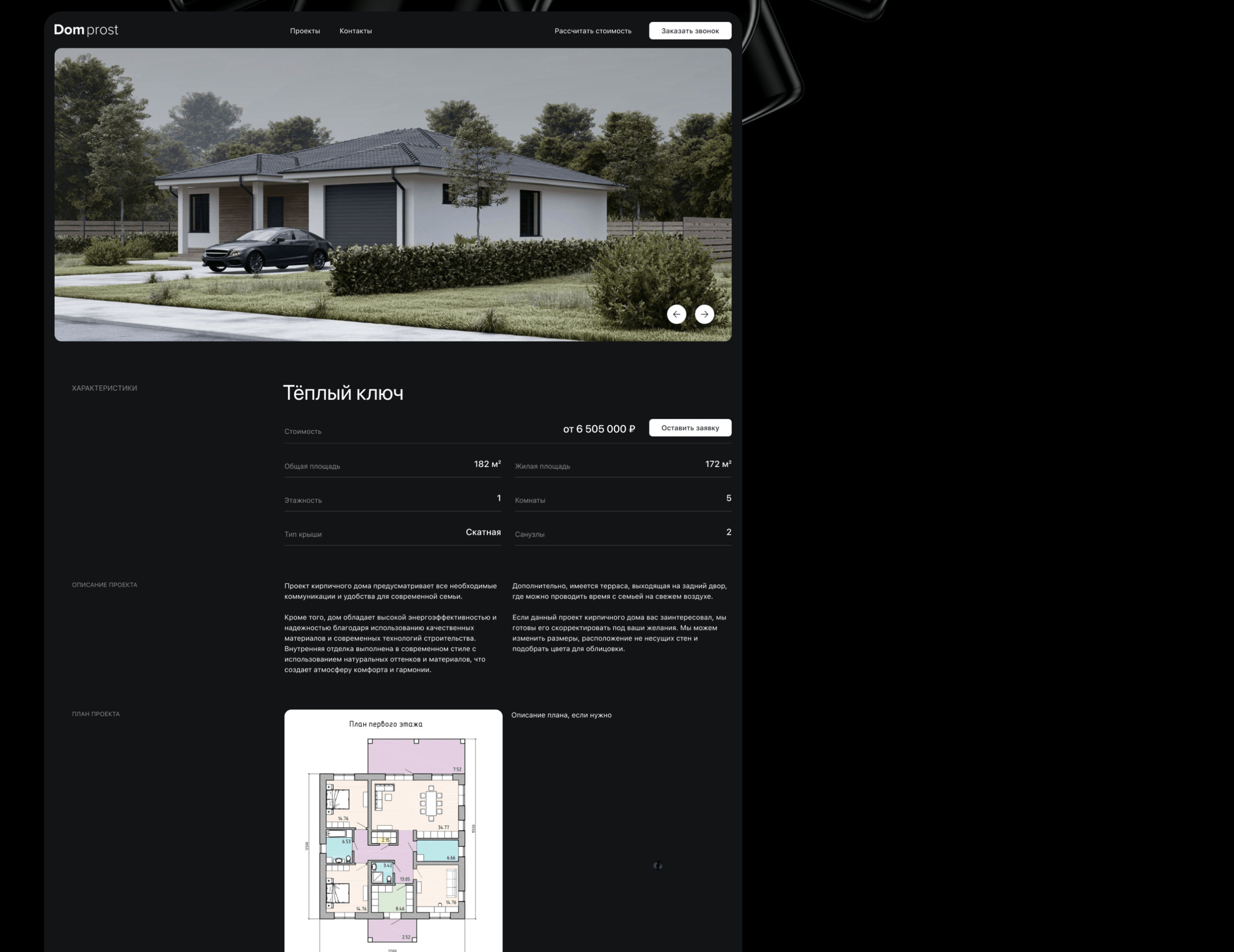 – На главной — чёткий оффер, краткое УТП, фильтруемые проекты и вход в калькулятор. Всё, что нужно клиенту на старте.