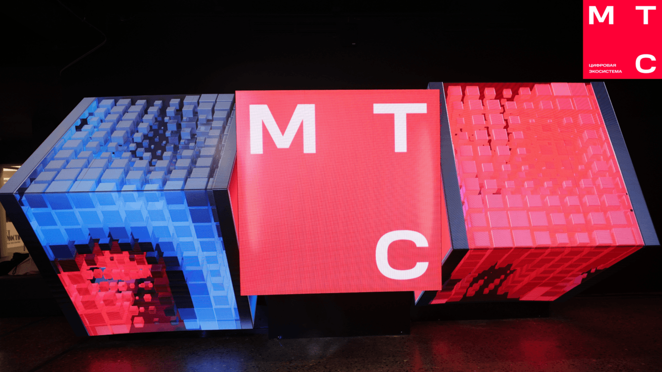 В создании третьего ролика у студии Akademia была полная свобода творчества, ограниченная только гайдлайнами МТС. Нужно было сделать захватывающий визуал в главных цветах бренда, красном и синем. Здесь мы также вдохновились логотипом и создали из сотен маленьких кубов постоянно меняющуюся абстракцию, которая полностью заполнила пространства боковых экранов и продолжала идею прогрессивности и гибкости бренда. В центральной части отображался логотип МТС, цвет которого поддерживался в абстракции.