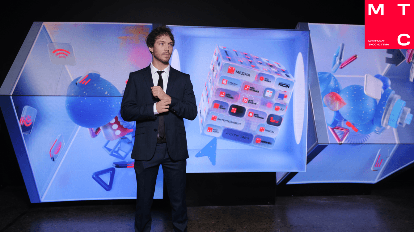 Первый ролик рассказывал о продуктах экосистемы МТС, задачей было сделать его одновременно информативным и увлекательным. Мы наполнили боковые кубы абстрактными объектами в айдентике бренда, которые хаотично летали в полом пространстве куба, постоянно соприкасаясь – так мы показали экосистемность всех продуктов бренда. Левитирующие формы также создавали очень динамичную картинку, которая отражала репутацию МТС как компании, находящейся в постоянном движении. В центральной части инсталляции отображался перечень продуктов экосистемы. Такая композиция позволила как рассказать об услугах бренда, так и запомниться гостям мероприятия необычными визуалами.