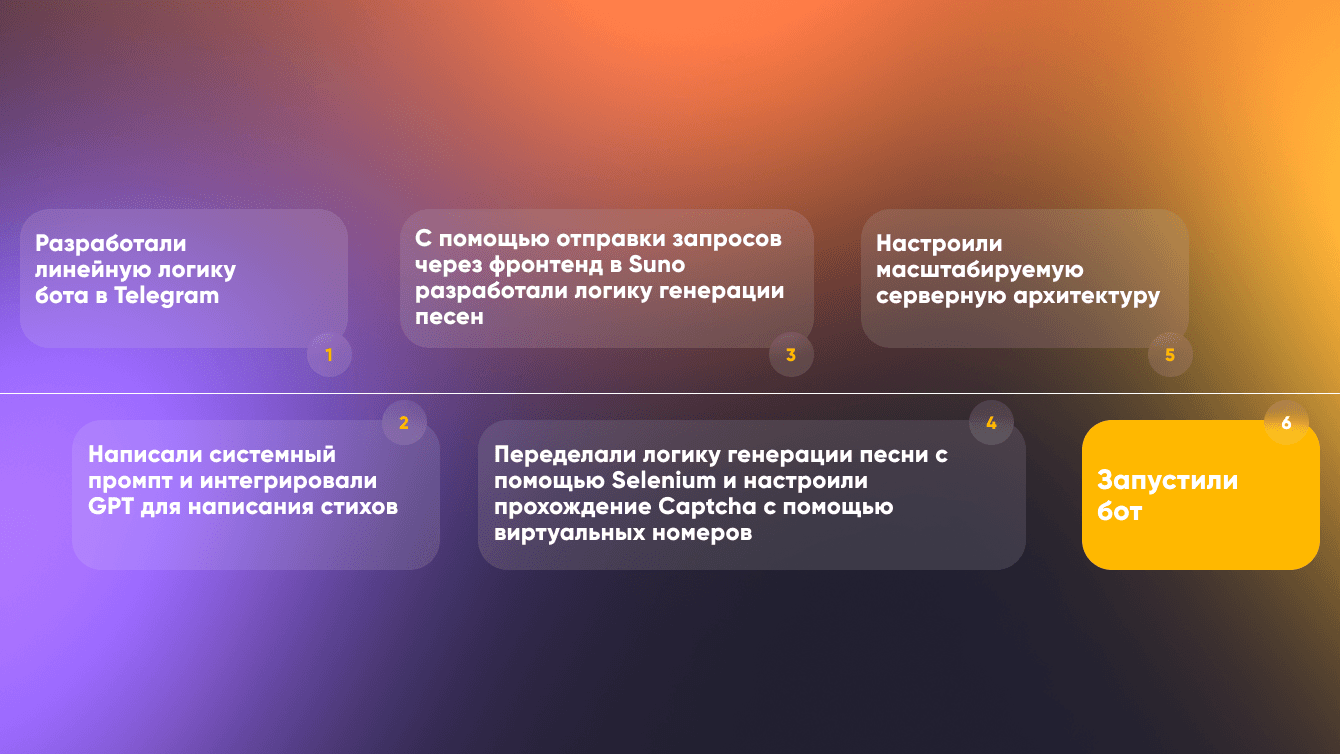 Интеграция с сервисом генерации треков - столкнулись с техническими ограничениями и обновлениями на стороне поставщика, что потребовало гибкости и быстрой адаптации нашего решения.