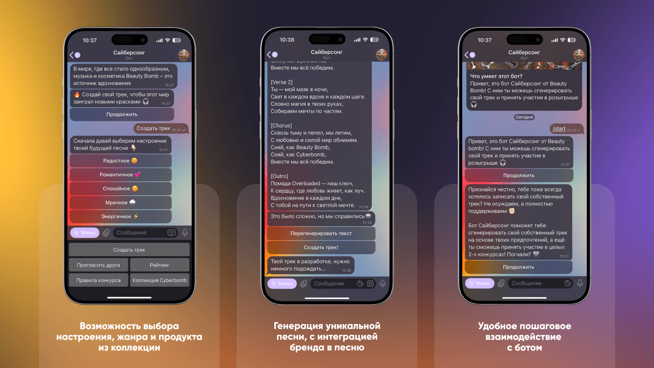 Создать интерактивного чат-бота, который через персонализированные тексты и музыкальные треки продвигает коллекцию Cyberbomb от Beauty Bomb, усиливая вовлеченность и эмоциональную связь с аудиторией.