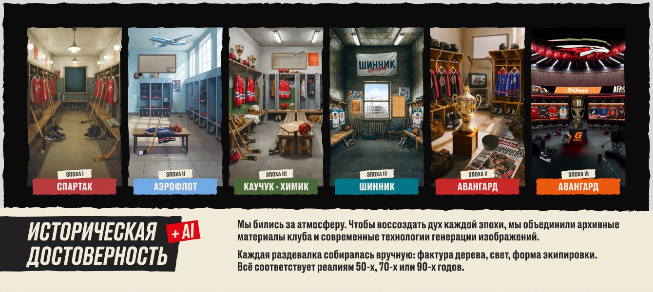 Наш проект – машина времени, которая переносит пользователя в раздевалку легендарного клуба. 6 локаций – 6 эпох становления и развития «Авангарда».