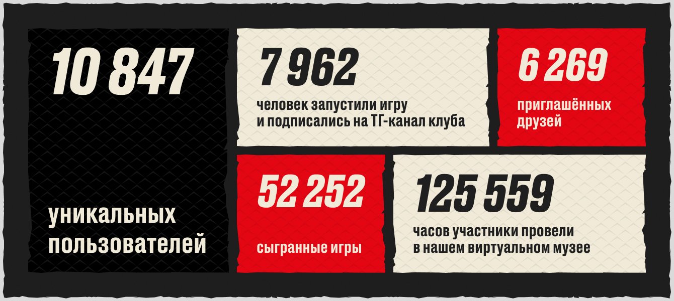 Общее количество сыгранных игр составило 52252, более 125 тысяч часов провели участники в нашем виртуальном музее. 10847 уникальных пользователей увидели проект, 7962 человека запустили игру и подписались на ТГ-канал клуба, 6269 своих друзей пригласили сами пользователи