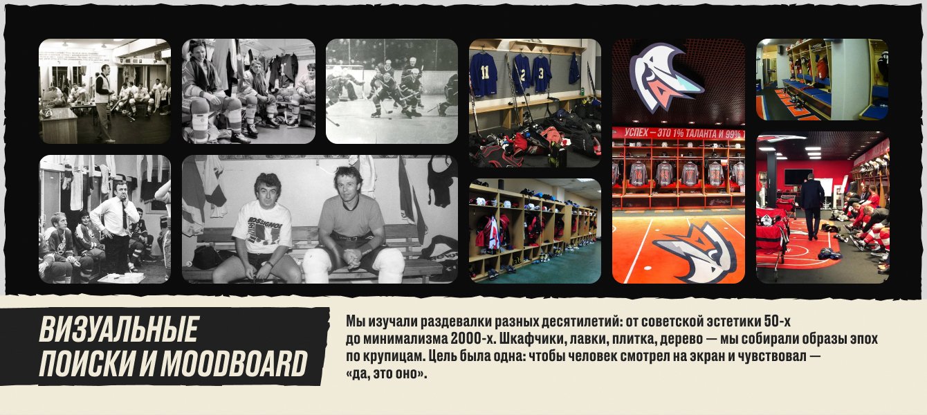 На дизайне мы бились за достоверность картинки, поэтому сосредоточились на поиске референсов интерьеров для раздевалок разных эпох (50-е, 70-е, 90-е годы и т.д.) и предоставленных партнером фото и видео материалов. Для визуализации использовали генерации ИИ, прорабатывая варианты фонов, шкафчиков, скамеек и других элементов. Дизайнер дорабатывал и собирал финальное изображение эпохи по кусочкам, добиваясь исторической точности. Все сгенерированные изображения на каждом этапе сравнивались с реальными архивными фотографиями и видео материалами клуба.