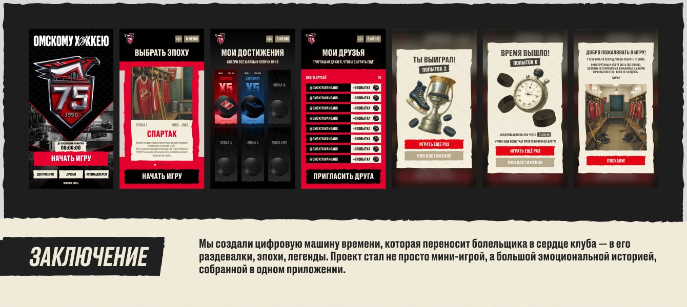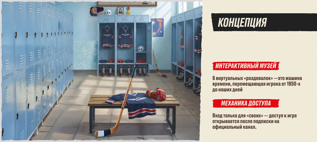 Это цифровая “машина времени”, которая перемещает зрителя по истории клуба сквозь года, от самого основания и до наших дней. Каждая «раздевалка» – это новая эпоха, где можно изучить детализированное изображение, просмотреть эксклюзивный видеоролик об эпохе, принять участие в игре по поиску скрытых шайб и получить виртуальные трофеи за успешное выполнение заданий. Трофеи определяют позицию пользователя в общем рейтинге и предоставляют шанс выиграть реальные призы от клуба.
