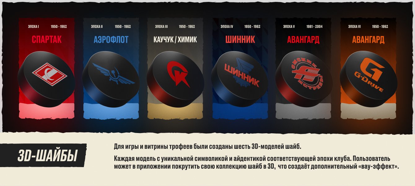 Для игры и витрины трофеев были созданы шесть 3D-моделей шайб. Каждая модель с уникальной текстурой, символикой и айдентикой соответствующей эпохи клуба. Пользователь может в приложении покрутить свою коллекцию шайб в 3D, что создает дополнительный «вау-эффект».