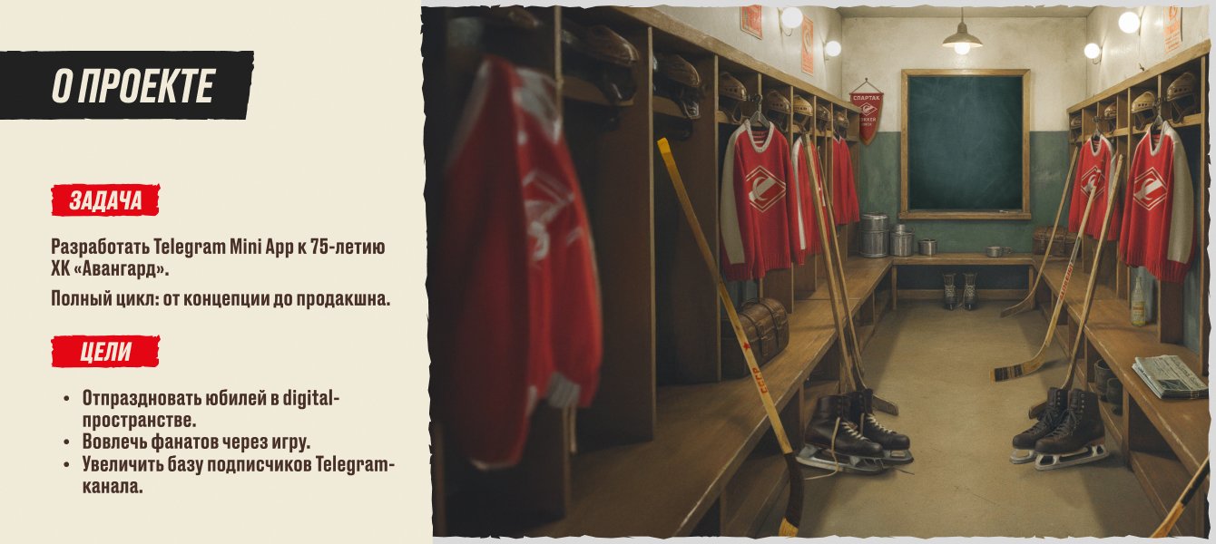 Легендарному хоккейному клубу “Авангард” в 2025 году исполнилось 75 лет. К этой дате было организовано масштабное празднование, наша задача была – полностью взять на себя всю разработку диджитального проекта к этому событию: программирование, тестирование, создание механик и геймплея. Цели проекта – “отпраздновать” дату в цифровом пространстве, создать памятный опыт для болельщиков и увеличить количество подписчиков в официальном Telegram-канале клуба.