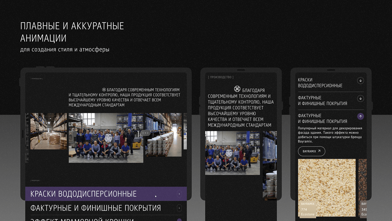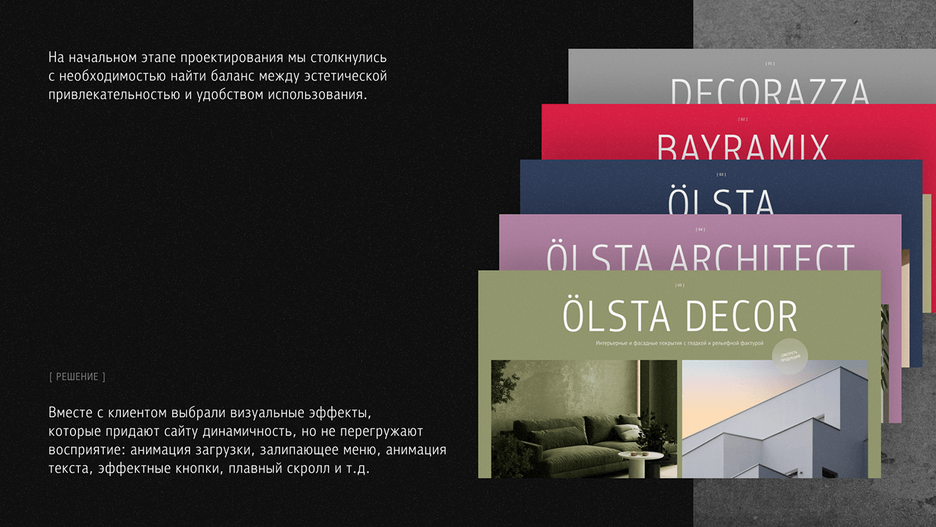 Использовали примеры международных веб-сайтов, победивших в конкурсах в сфере веб-дизайна, чтобы выбрать визуальные эффекты, которые бы соответствовали брендбуку компании и сочетались между собой.