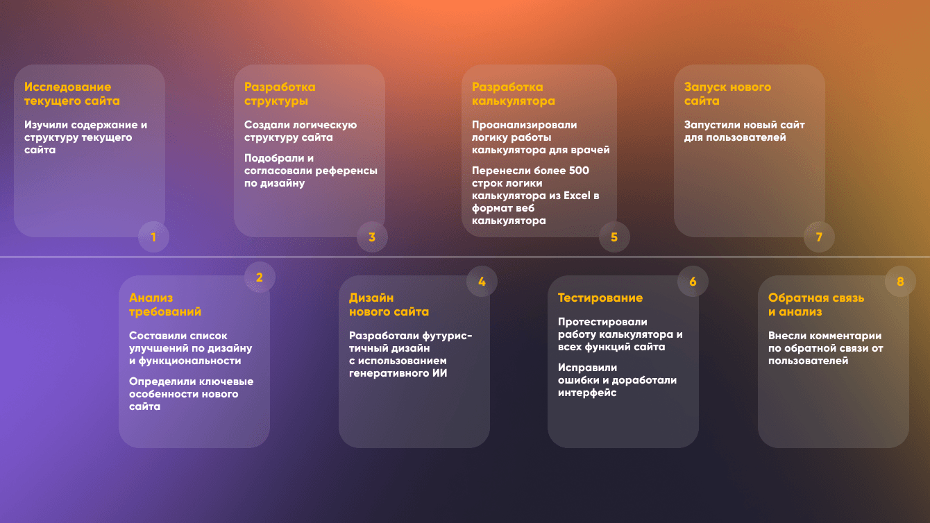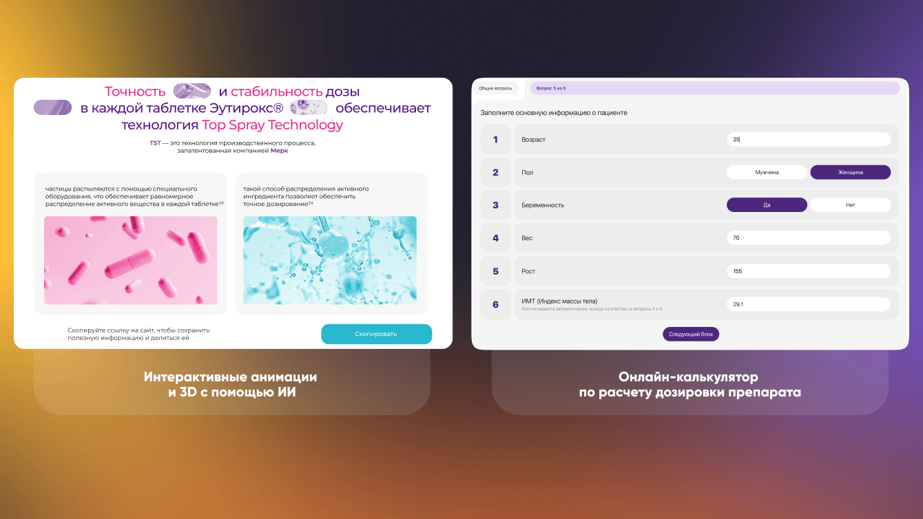 Также на более 500 строк с описанием логики в Excel мы разработали онлайн-калькулятор по расчету дозировки препарата, которая основывается на индивидуальных особенностях каждого пациента и его клинического случая, а также 2 вспомогательных калькулятора.