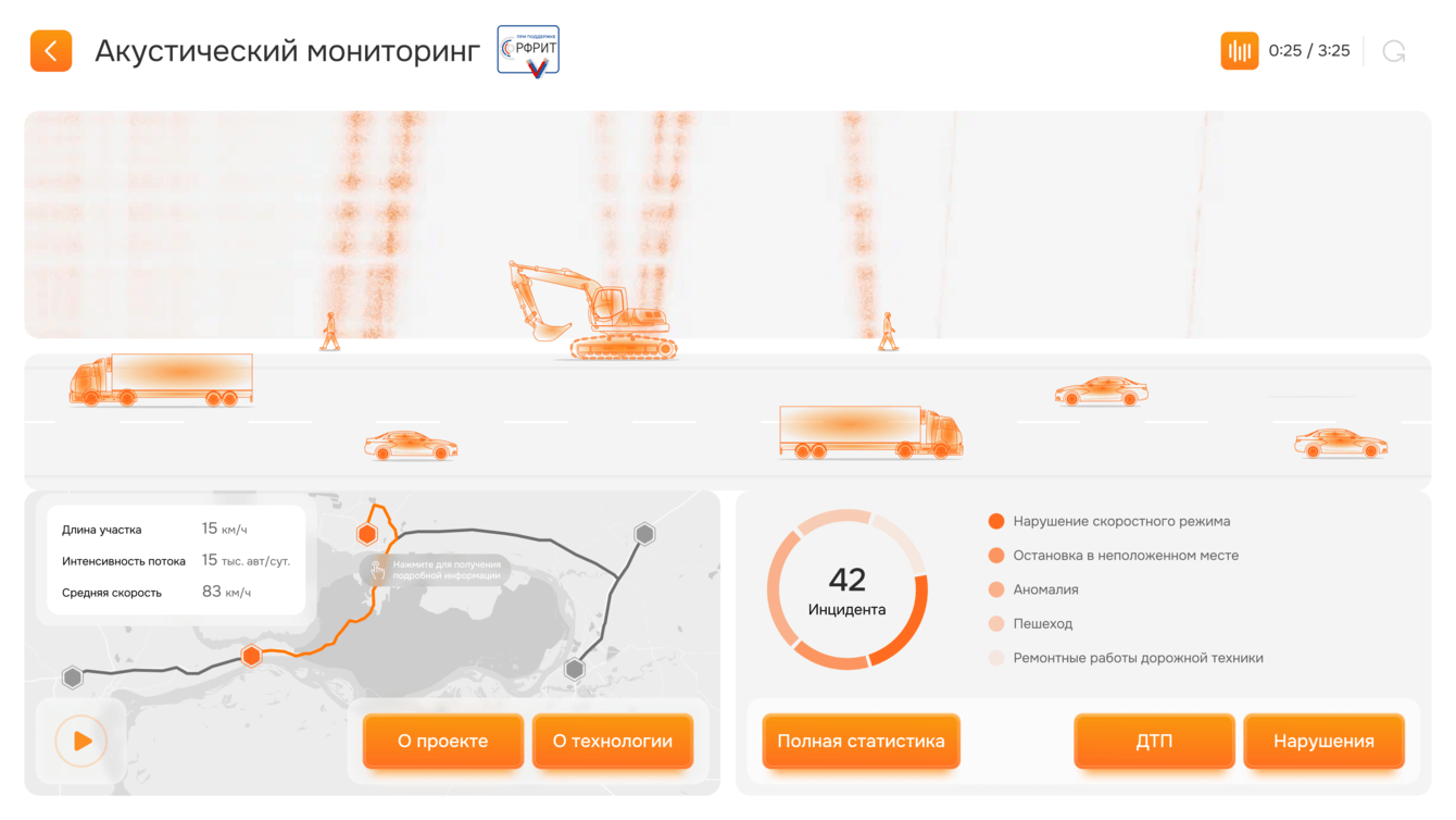 В приложении эта технология представлена в виде живого "сейсмографа", где пользователь может наблюдать, как система в реальном времени рисует и отображается карту движения ТС на участке дороги.