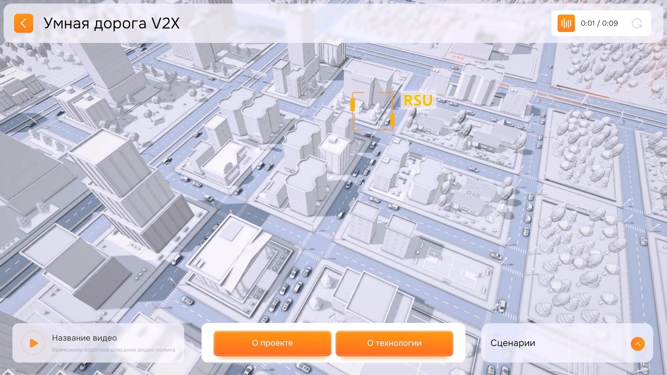 Мы реализовали интерактивный 3D город, в котором пользователь мог запускать различные сценарии работы системы. Например, модель движения скорой помощи или предотвращение бокового столкновения на перекрёстке. Анимации сопровождались дикторской озвучкой, которая объясняла происходящее на экране.