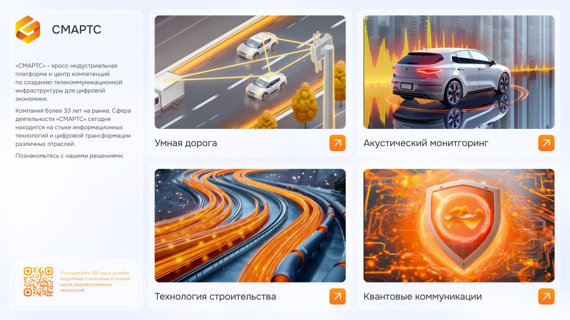 Интерактивный стенд презентации технологии умных дорог для выставки Компания СМАРТС, специализирующаяся на технологиях умного города и безопасности на дорогах, регулярно участвует в бизнес-конференциях и форумах. Демонстрация их решений требовала упрощённого и наглядного представления сложных технологических процессов. Первоначально коллеги использовали презентацию в PowerPoint для демонстрации работы технологий, но хотели улучшить визуальную подачу и сделать демонстрацию более интерактивной.