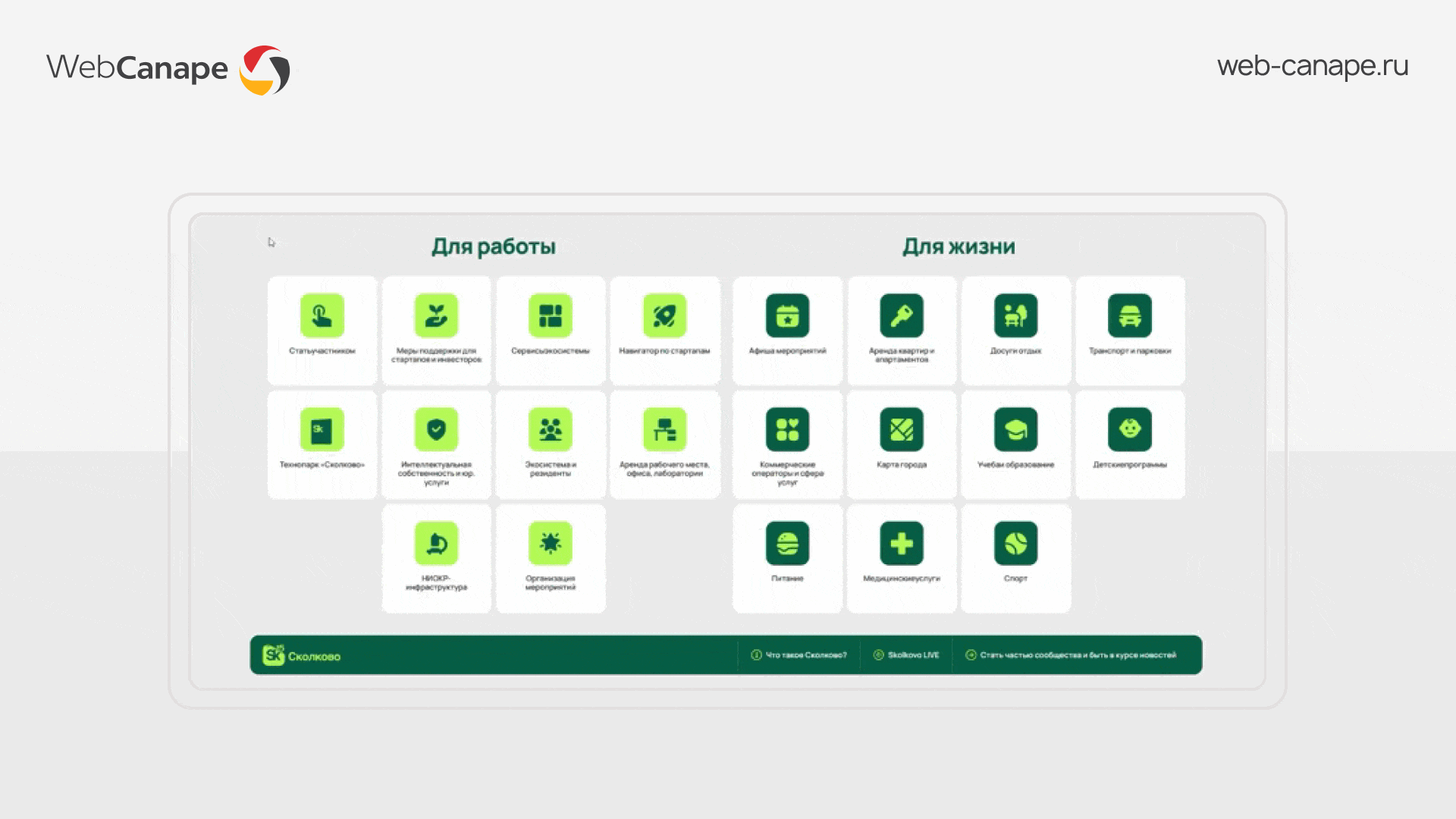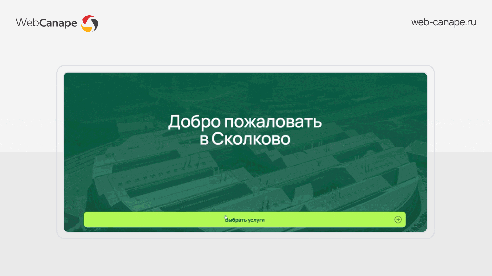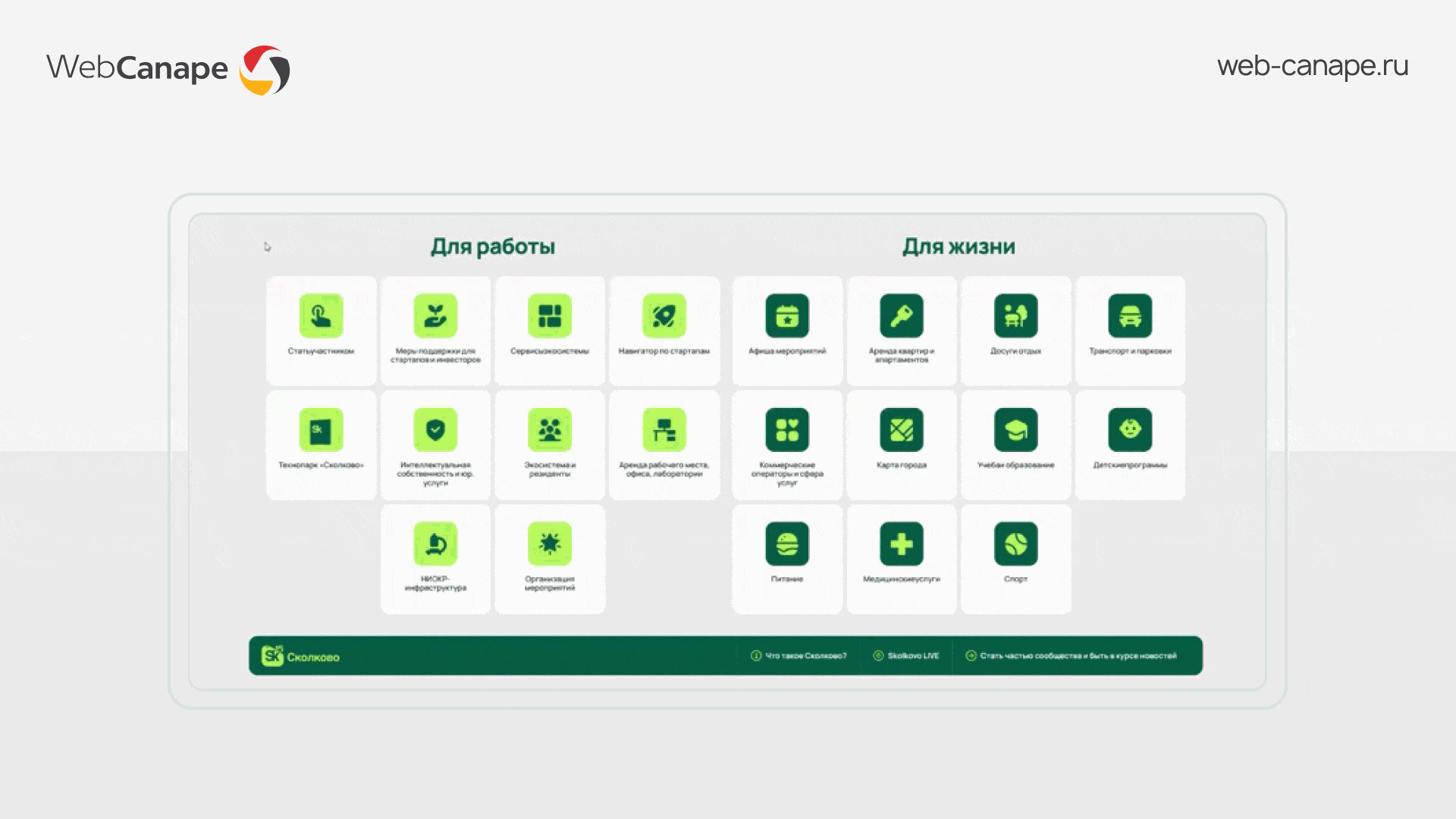 Технопарк «Сколково» выражает признательность компании WebCanape за разработку интерфейса информационной панели Единого Центра Услуг «Сколково».