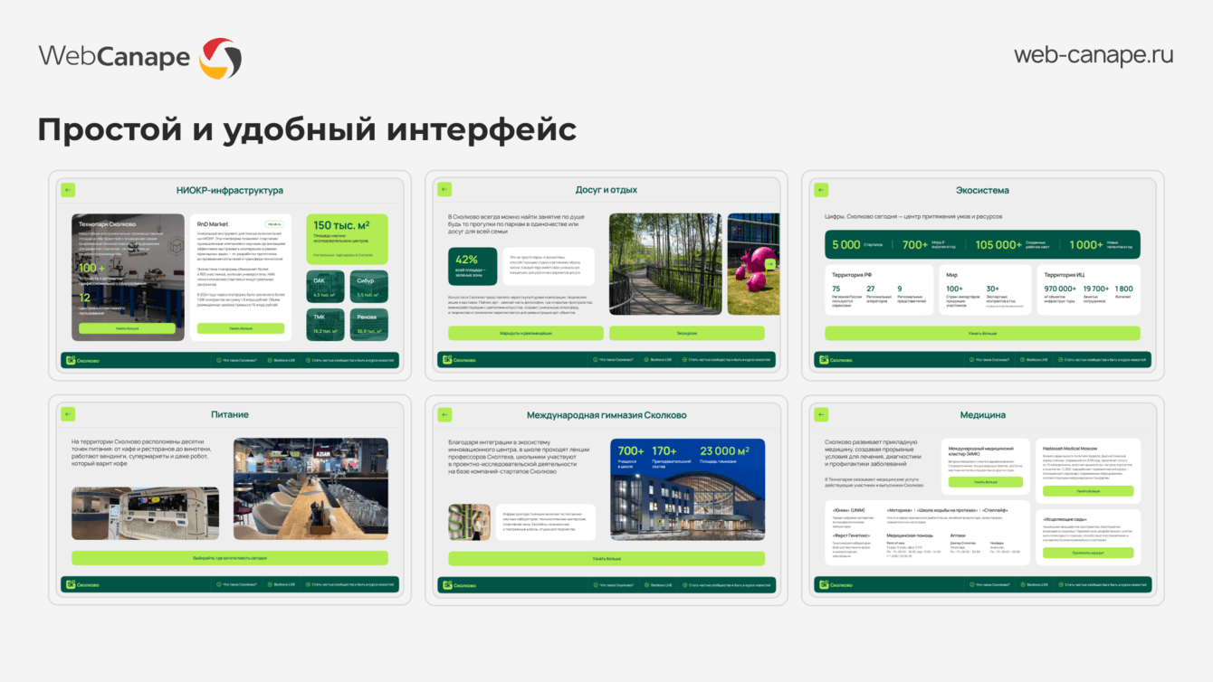 Поэтому навигация была построена на крупных, легко различимых блоках, каждый из которых содержал полный и самодостаточный набор данных по разделу. Такой подход позволил посетителю быстро находить нужное, не переходя между множеством экранов.