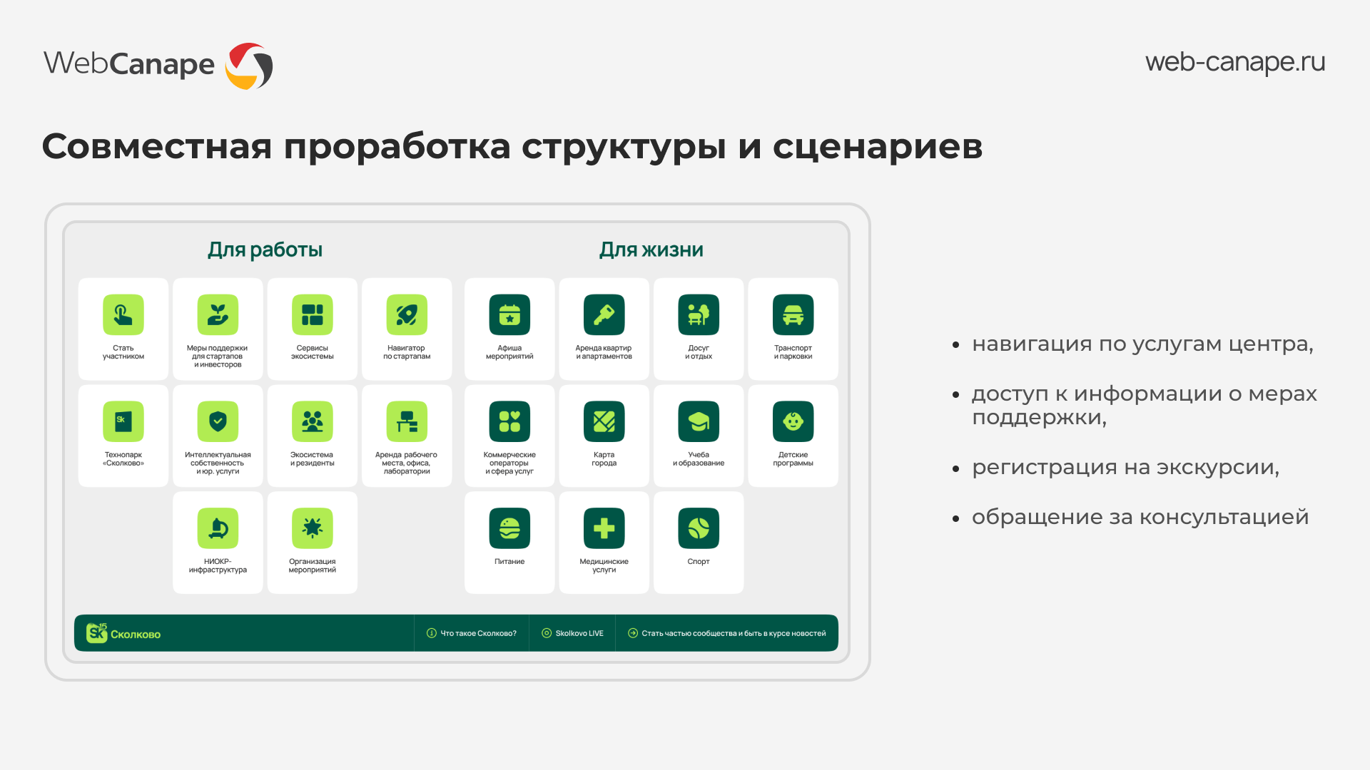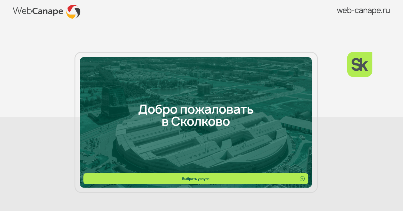 Технопарк «Сколково» выражает признательность компании WebCanape за разработку интерфейса информационной панели Единого Центра Услуг «Сколково».
