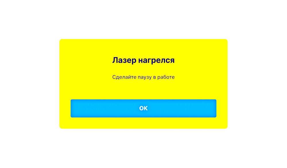 По запросу заказчика разработали типовые диалоговые окна с разным набором кнопок и традиционными сценариями в минималистичном стиле. В уведомлении о перегреве лазера использовали акцентные цвета, которые сигнализируют о критическом состоянии аппарата.