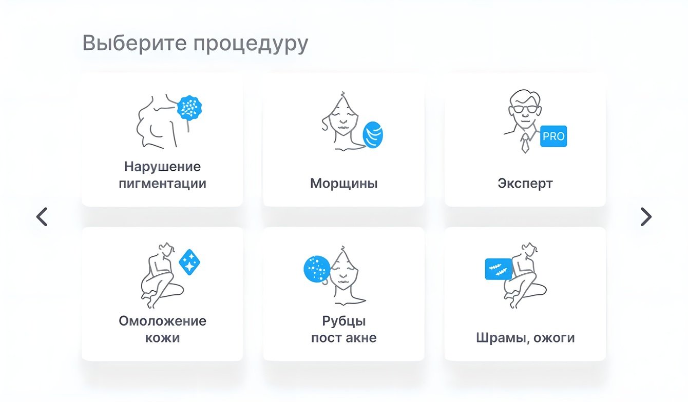 Так как некоторым врачам удобнее включать готовые программы, мы создали меню с выбором процедур. Для каждого режима отрисована своя иконка, которая продолжает тематику процедуры и помогает пользователю быстрее найти нужную плашку. Всего создано 15 иконок для уникального стиля Azor.
