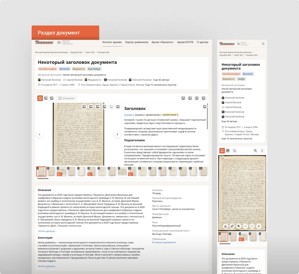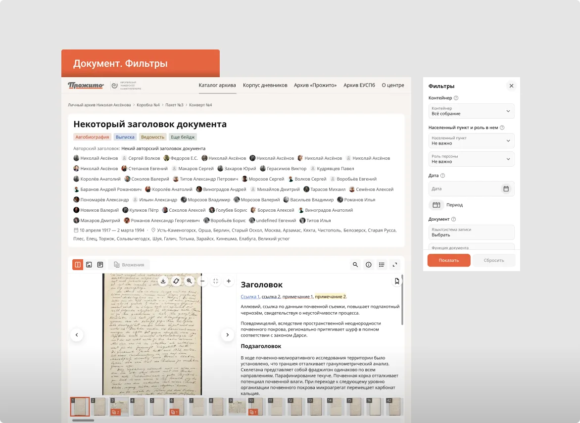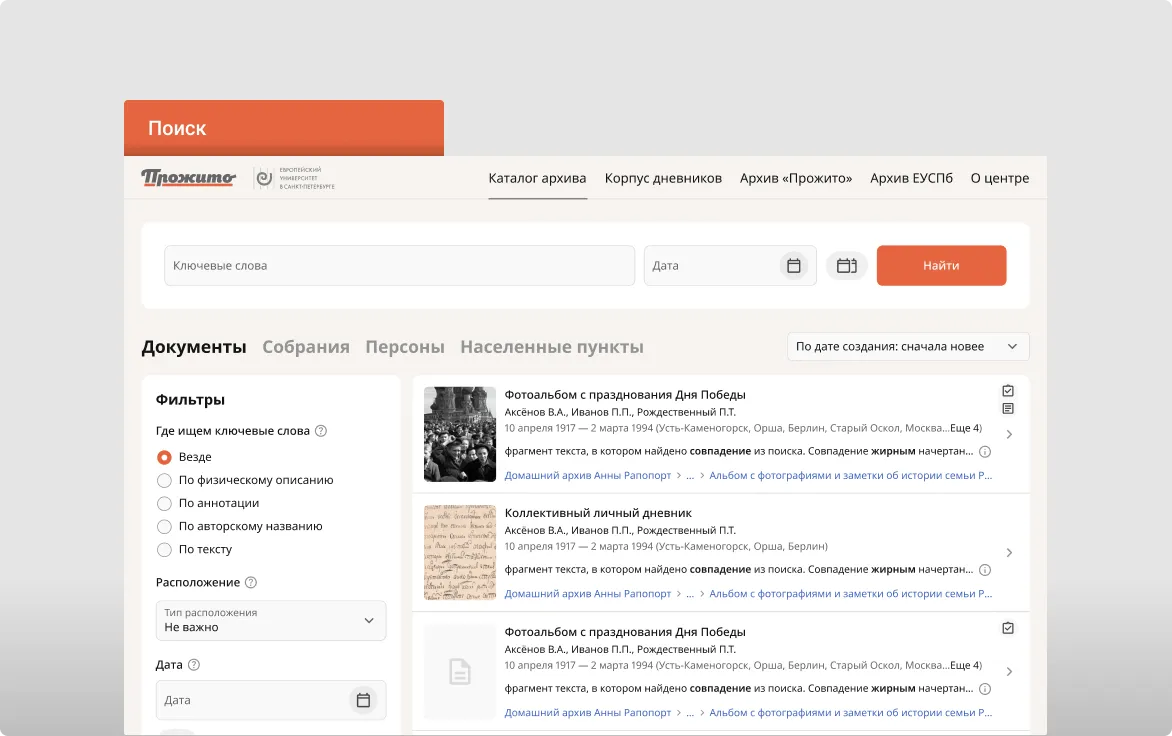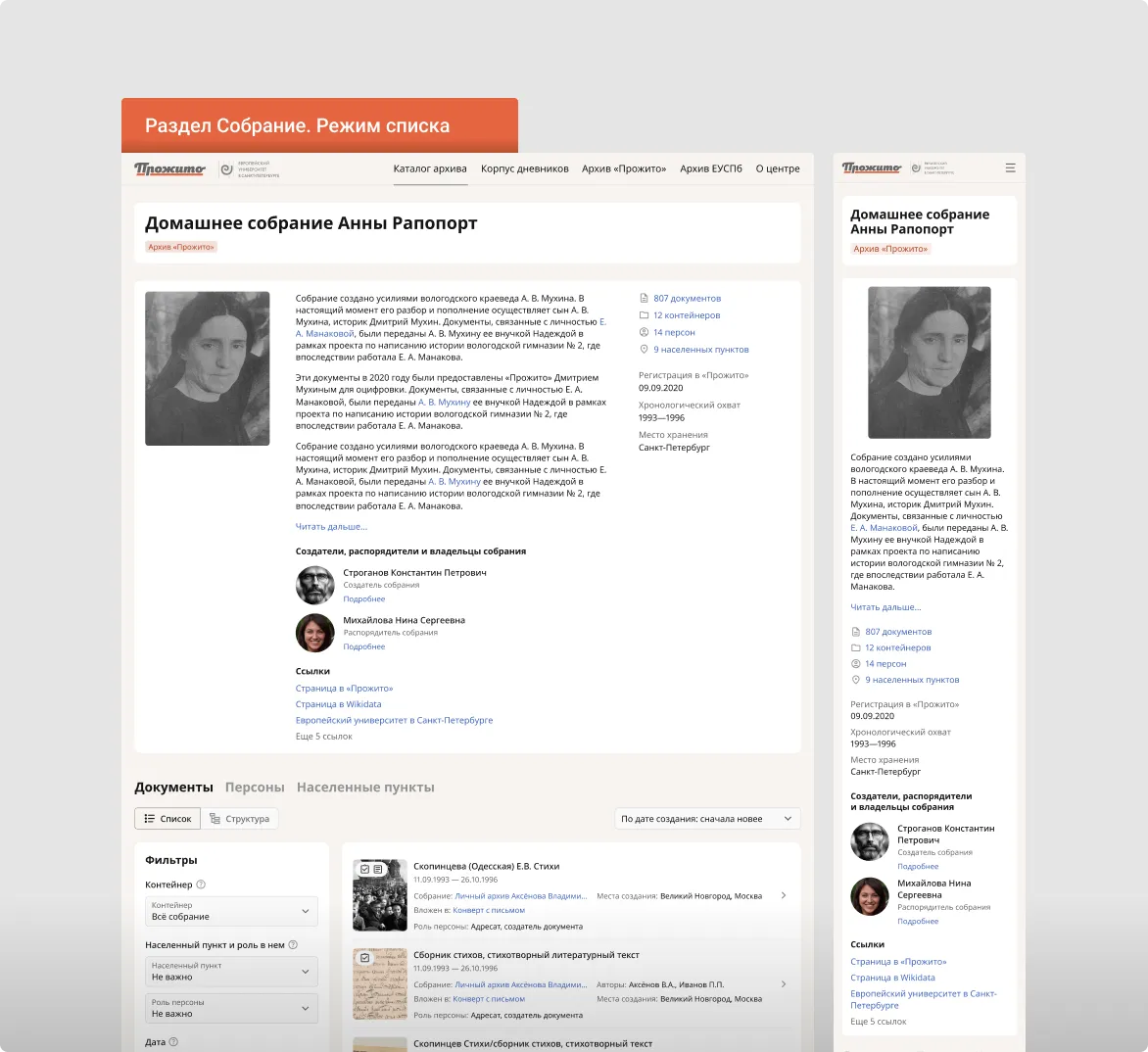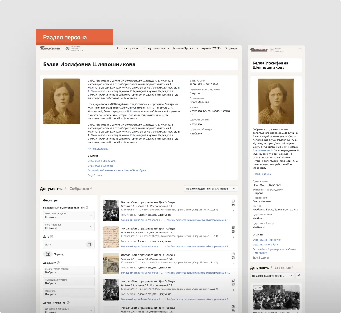 Один из элементов этой платформы — каталог архива «Прожито», площадка для совместной работы кураторов домашних собраний документов и архивистов Европейского университета в Санкт-Петербурге.