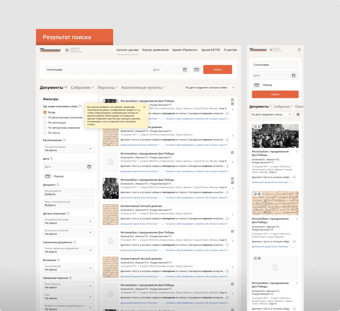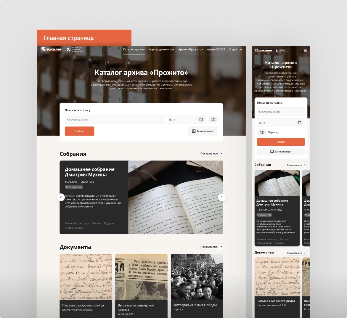 Создали удобный современный дизайн интерфейса каталога архивов «Прожито», провели тестирование прототипа и передали макеты в разработку.